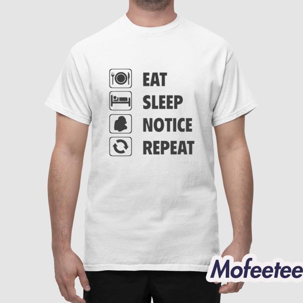 The shirt features four iconic symbols paired with the words “Eat,” “Sleep,” “Notice,” and “Repeat.” The design is simple but effective, using universally recognized icons to represent each action. The graphic is clean and bold, making it clear and easy to read from a distance. It’s a great way to add some fun to your daily life while wearing something comfortable and stylish.