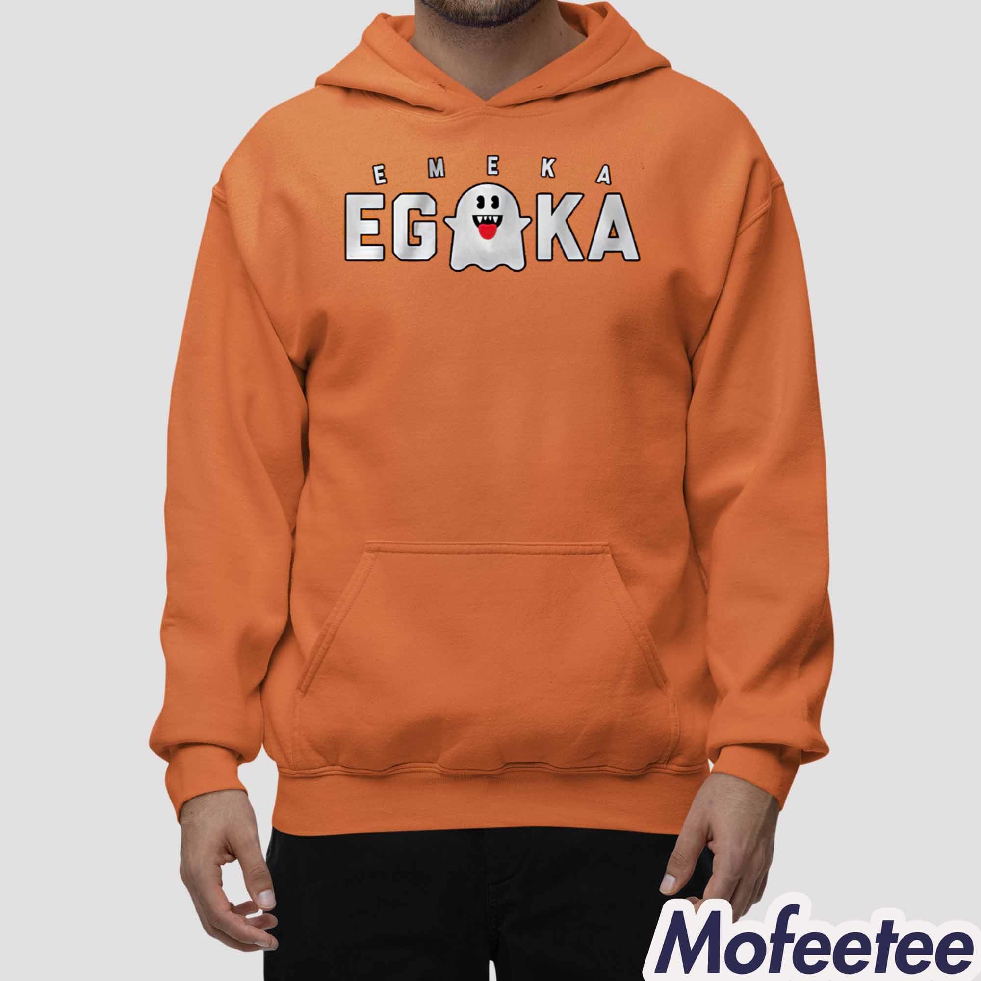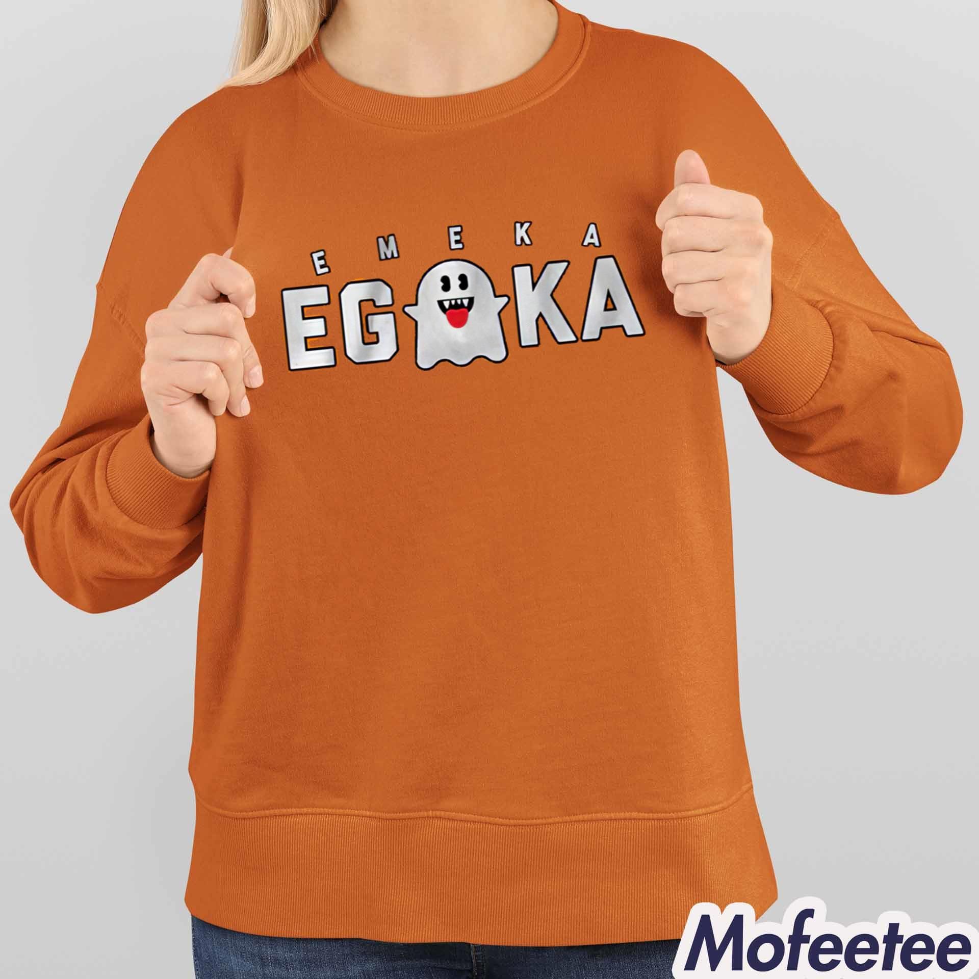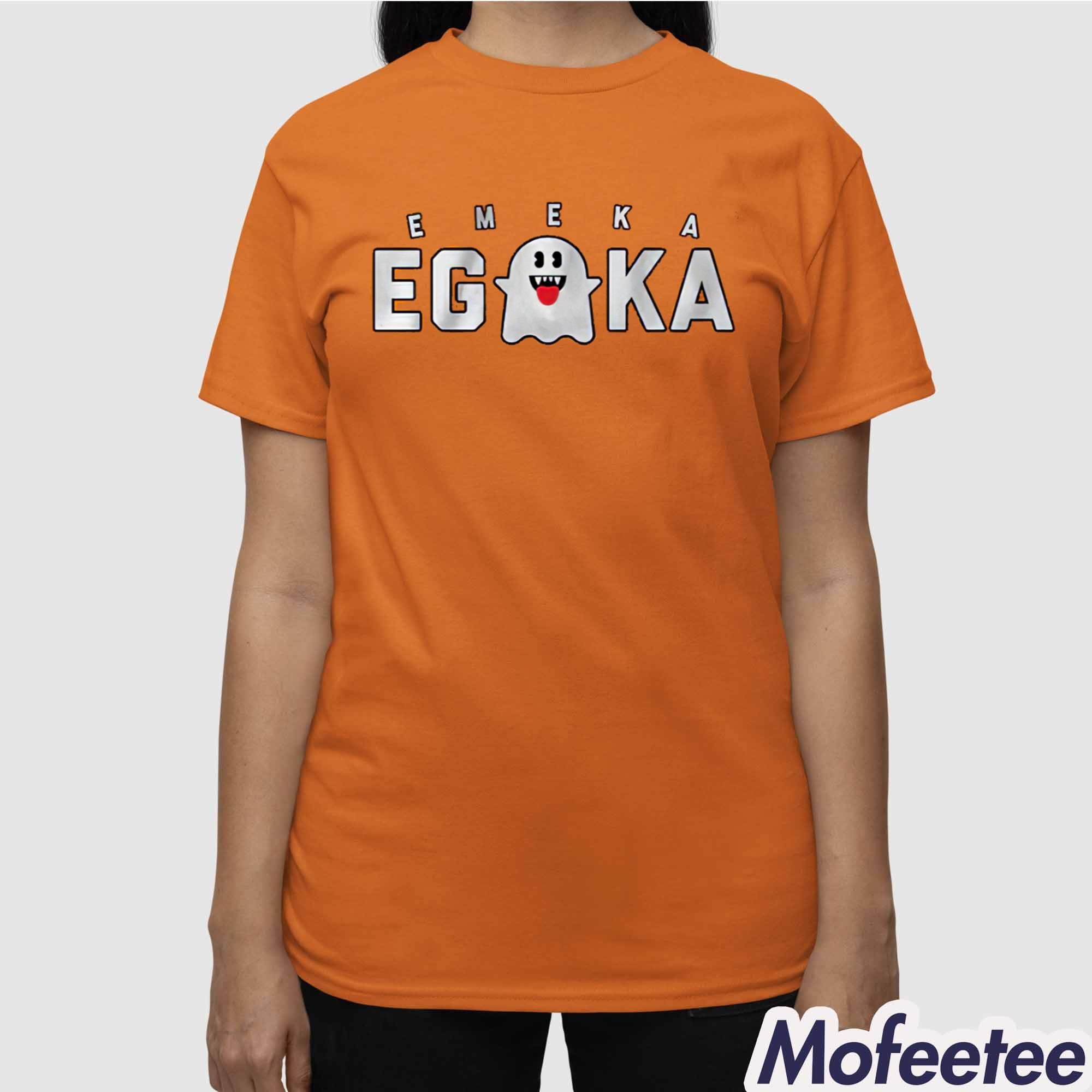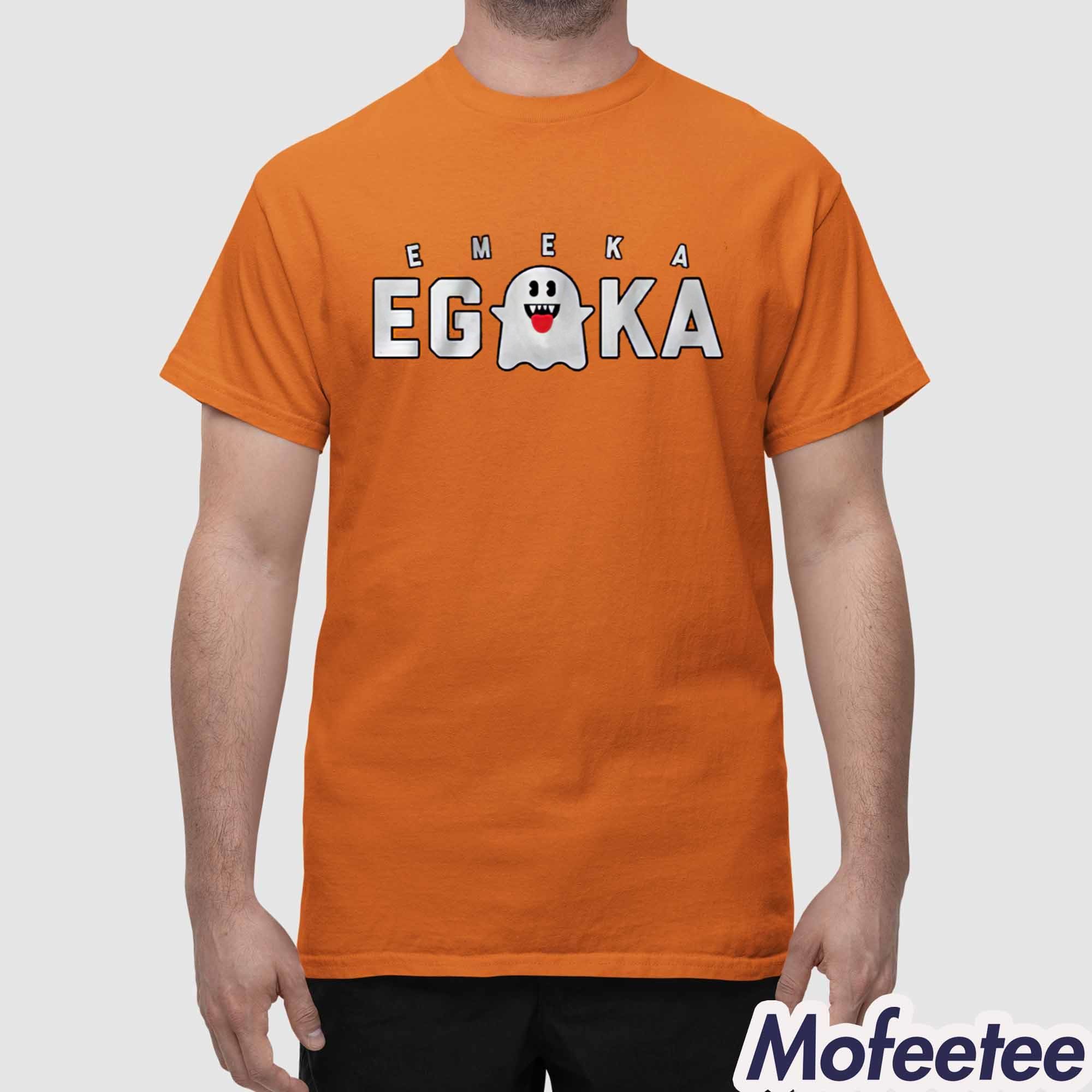 The design on the shirt features a clever play on Emeka Egbuka’s name, with the words “EMEKA EGBUKA” styled to resemble the iconic ghost emoji and pronounced “Eg-Boo-Ka” in a fun, creative way. The design is bold and simple yet captures the spirit of Emeka’s personality and football journey. The playful graphic adds a touch of humor while showing your support for Emeka’s athletic achievements.