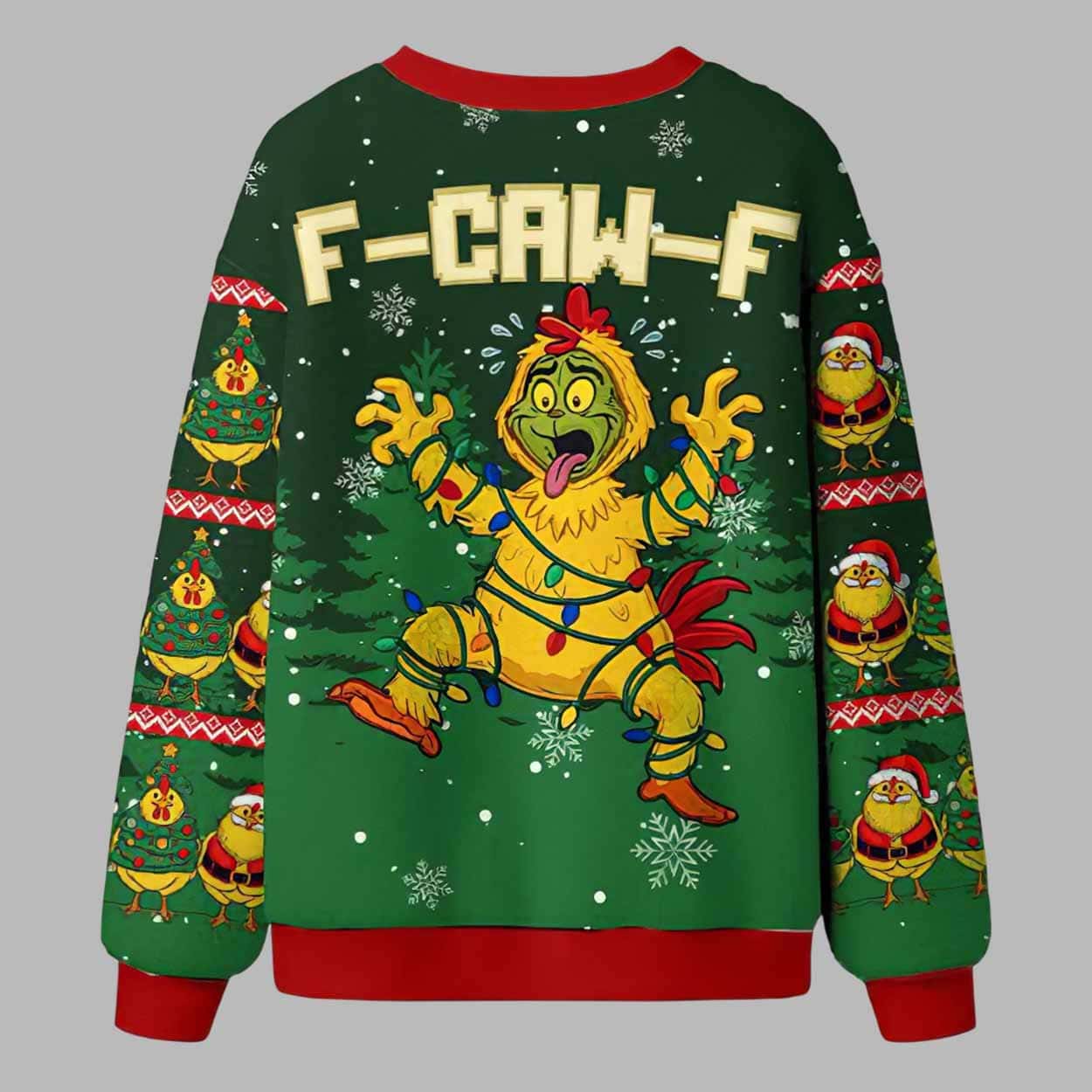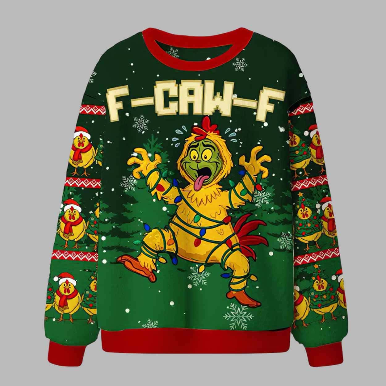 The ugly christmas sweater captures the joy and chaos of the holidays with a hilarious twist. Featuring a cartoon chicken wrapped in Christmas lights and surrounded by snowflakes, this sweater brings a fun, mischievous vibe to your holiday wardrobe. The bold âF-CAW-Fâ slogan adds just the right touch of irreverent humor â making it a standout choice for anyone with a playful sense of style.