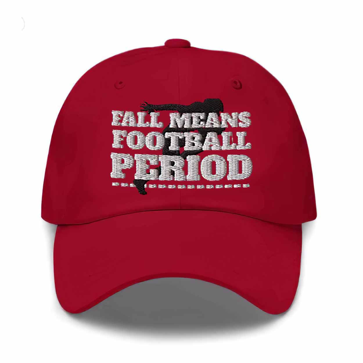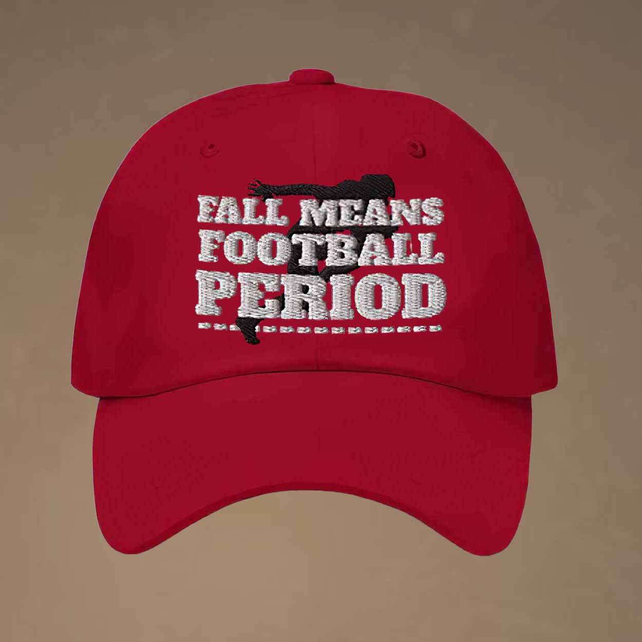 The hat features bold embroidered lettering that proudly declares “Fall Means Football Period”. With its eye-catching design and clean stitching, this hat is more than just fan gear—it’s a statement. The red base color makes the embroidered text pop, while the silhouette detail adds a touch of athletic flair.