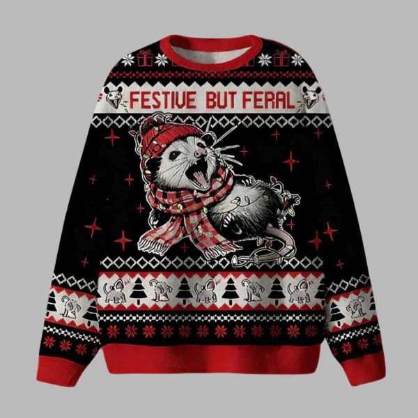 The ugly christmas sweater stands out with its quirky and festive design. The front showcases an opossum, with a playful and sassy expression, wearing a red and black plaid scarf and a matching hat. The words “Festive But Feral” are emblazoned across the top, making it clear that you’re embracing the fun and wild side of the holidays. With intricate detailing of snowflakes, stars, and holiday trees throughout the design, the sweater blends the Christmas spirit with a touch of cheeky humor.