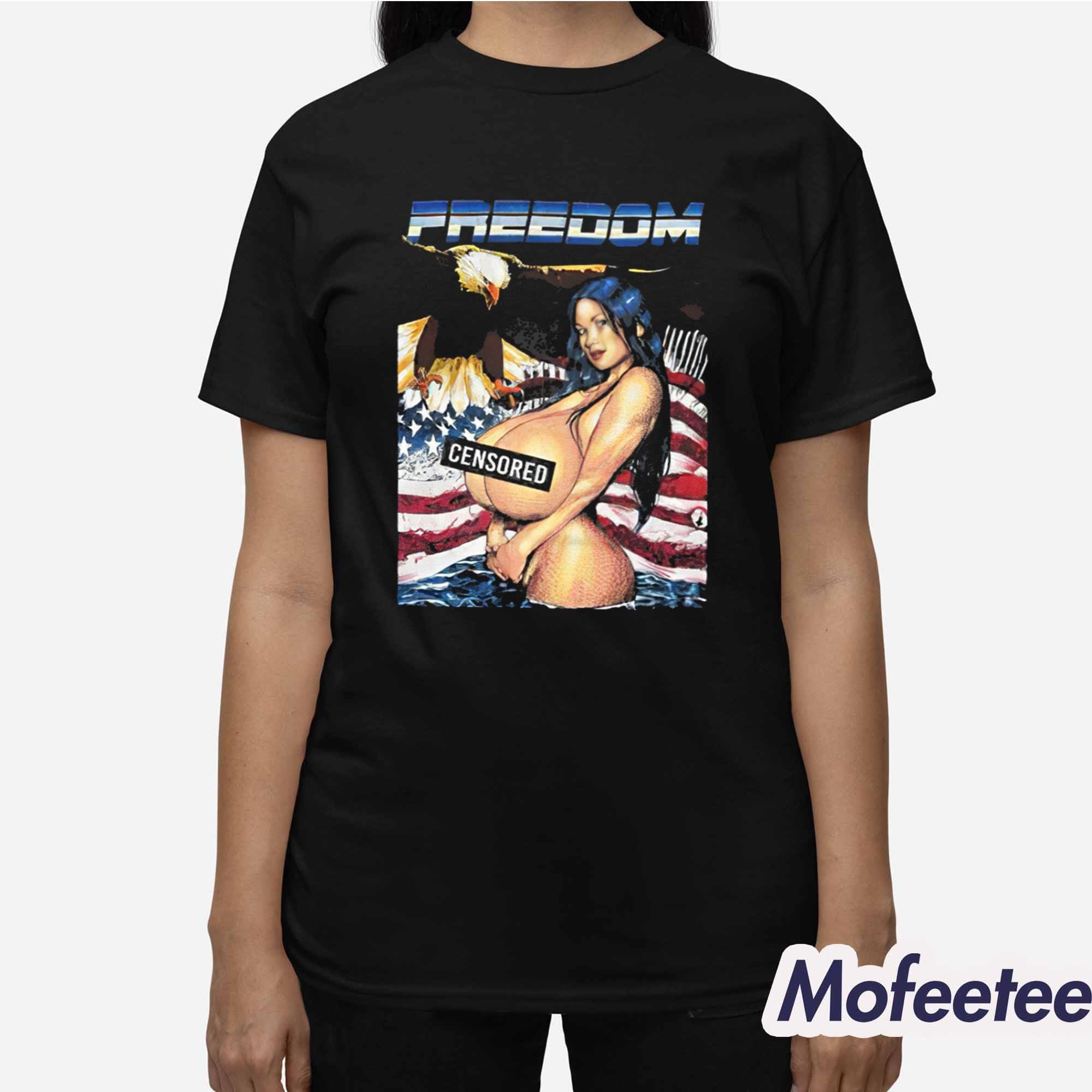 The shirt features a vibrant, detailed graphic that includes the word “FREEDOM” across the top and a censored image beneath, set against the backdrop of the American flag. This bold design makes a statement, celebrating the essence of free speech, liberty, and individuality.