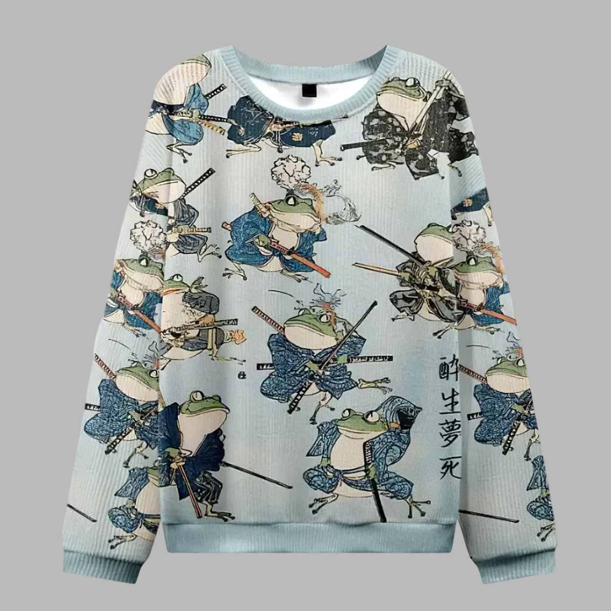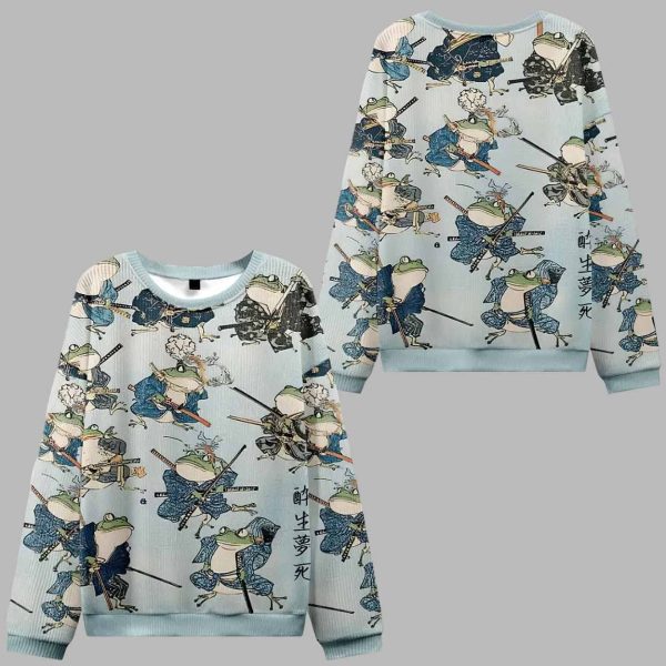 The ugly christmas sweater features a detailed all-over print of fearless frog samurais dressed in traditional Japanese armor, striking dynamic battle poses. Each character wields a katana, creating a playful mix of ancient honor and modern-day humor. The background showcases soft pastel tones reminiscent of traditional Japanese woodblock prints, adding elegance and balance to the fun design.
