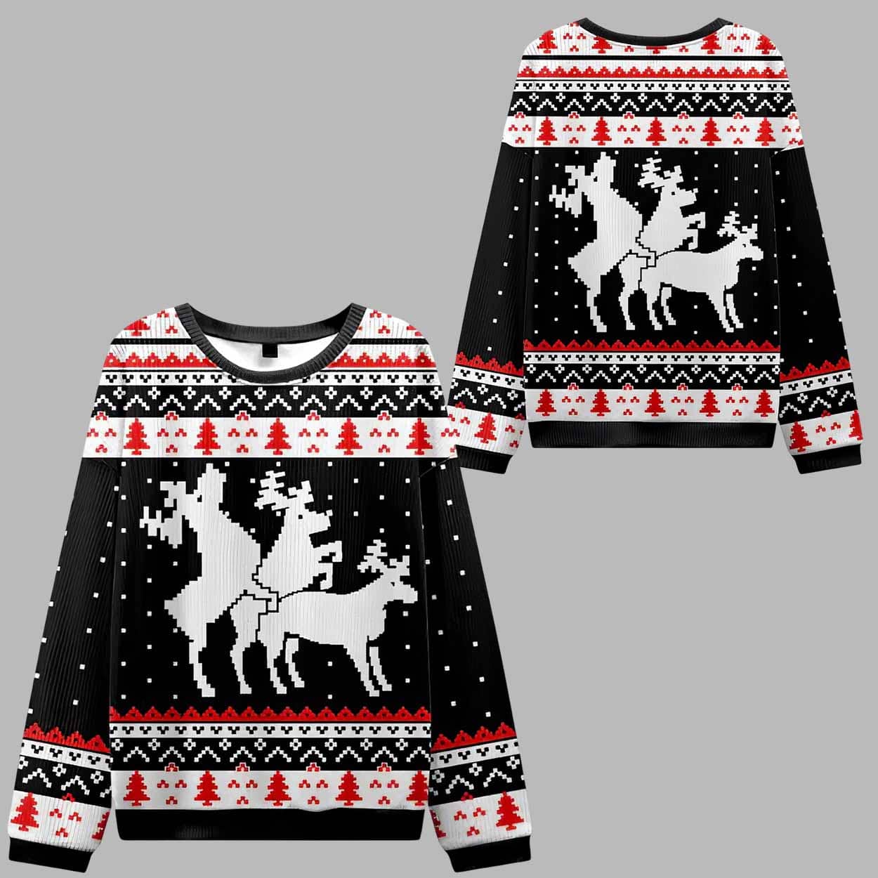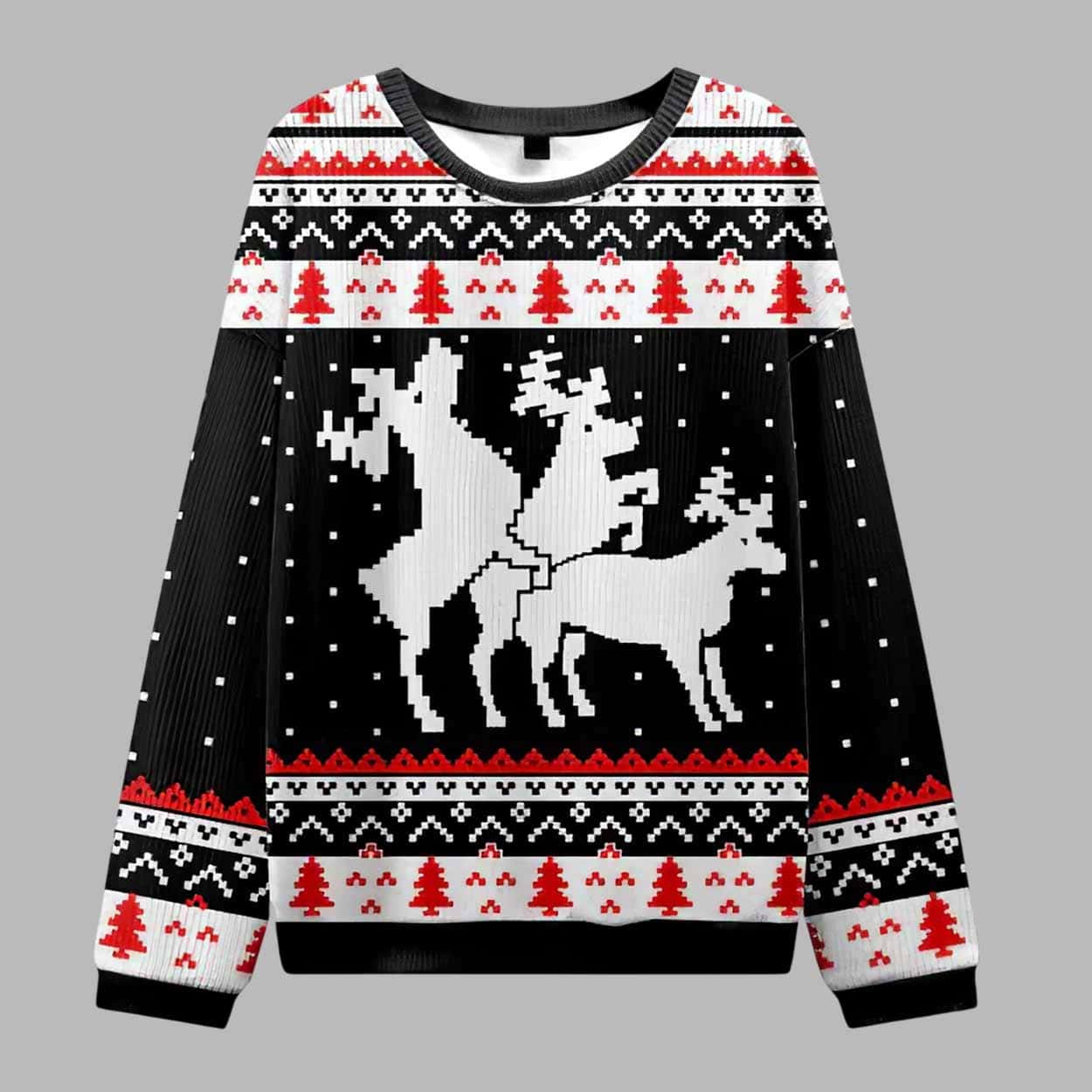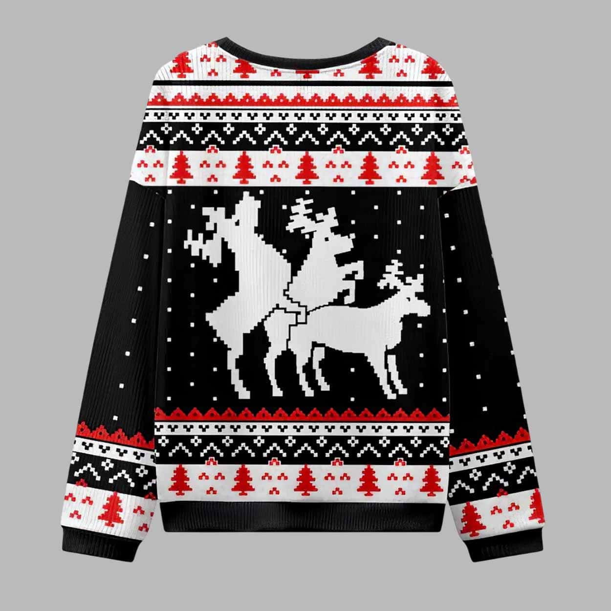 Get ready to steal the spotlight at every holiday party with the Fuck Elk Ugly Christmas Sweater. This bold and hilarious design is made for those who love to mix festive cheer with a touch of outrageous humor. Featuring a cheeky elk pattern in classic knit style, this sweater pushes the boundaries of traditional Christmas fashion â perfect for anyone who enjoys standing out, cracking jokes, and bringing laughter to every celebration. With its black background and contrasting red and white holiday patterns of snowflakes and Christmas trees, the ugly christmas sweater delivers that perfect âugly but awesomeâ look that everyone loves during the holidays.