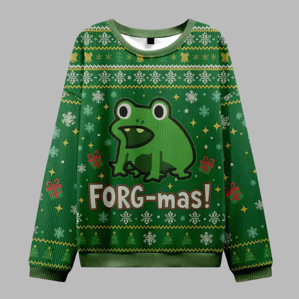 The ugly christmas sweater is crafted from a soft and durable polyester blend, ensuring comfort and warmth throughout the holiday season. The vibrant green base is adorned with traditional Christmas patterns, including snowflakes, gifts, and stars, adding a festive touch. At the center of the design is a large, smiling frog with the playful message “FORG-mas!” below, adding a fun and quirky twist to the holiday cheer.