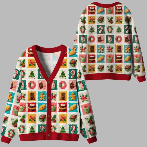 The ugly cardigan sweater features a delightful patchwork of Christmas-themed designs that capture the true essence of the holidays. Each square is a mini celebration — from gingerbread men and candy canes to Christmas trees, wreaths, and sweet treats — creating a playful mosaic of warmth and joy. The red ribbed trim along the neckline, cuffs, and hem adds a perfect pop of contrast, completing the classic holiday look.