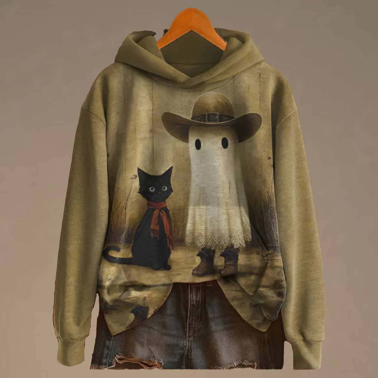 The front of the hoodie showcases the fun design of a ghost and a black cat standing side by side, both looking charming in their autumn attire. The soft colors and the playful elements of the design add to the hoodie’s whimsical yet spooky Halloween aesthetic. This hoodie features a warm beige color that complements the print, making it a versatile piece that pairs well with a variety of pants or skirts.
