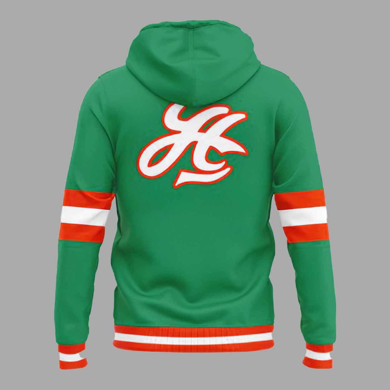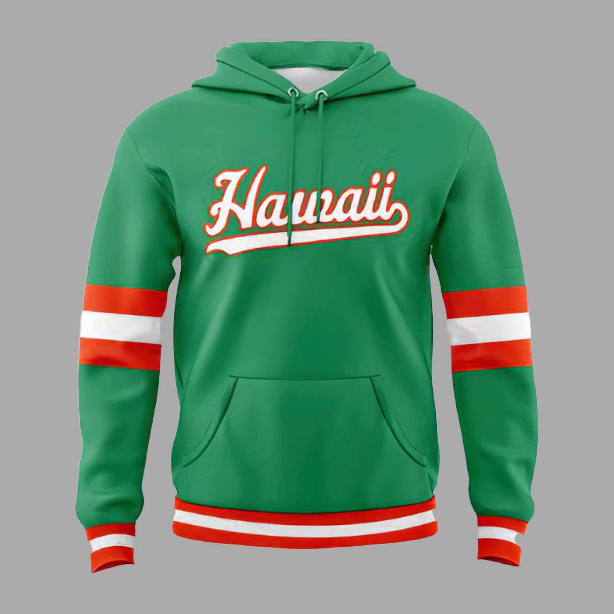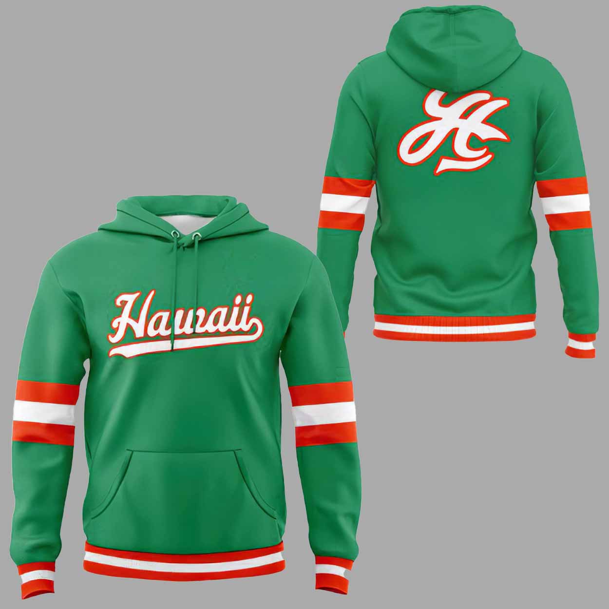 The hoodie features a rich kelly green base that instantly captures attention. The front showcases a bold “Hawaii” script across the chest, styled in a classic baseball font that adds a nostalgic yet modern feel. This design pays tribute to the baseball culture while proudly highlighting Hawaii as the centerpiece. On the back, a large “HC” graphic adds visual balance and reinforces the baseball-inspired identity of the hoodie.