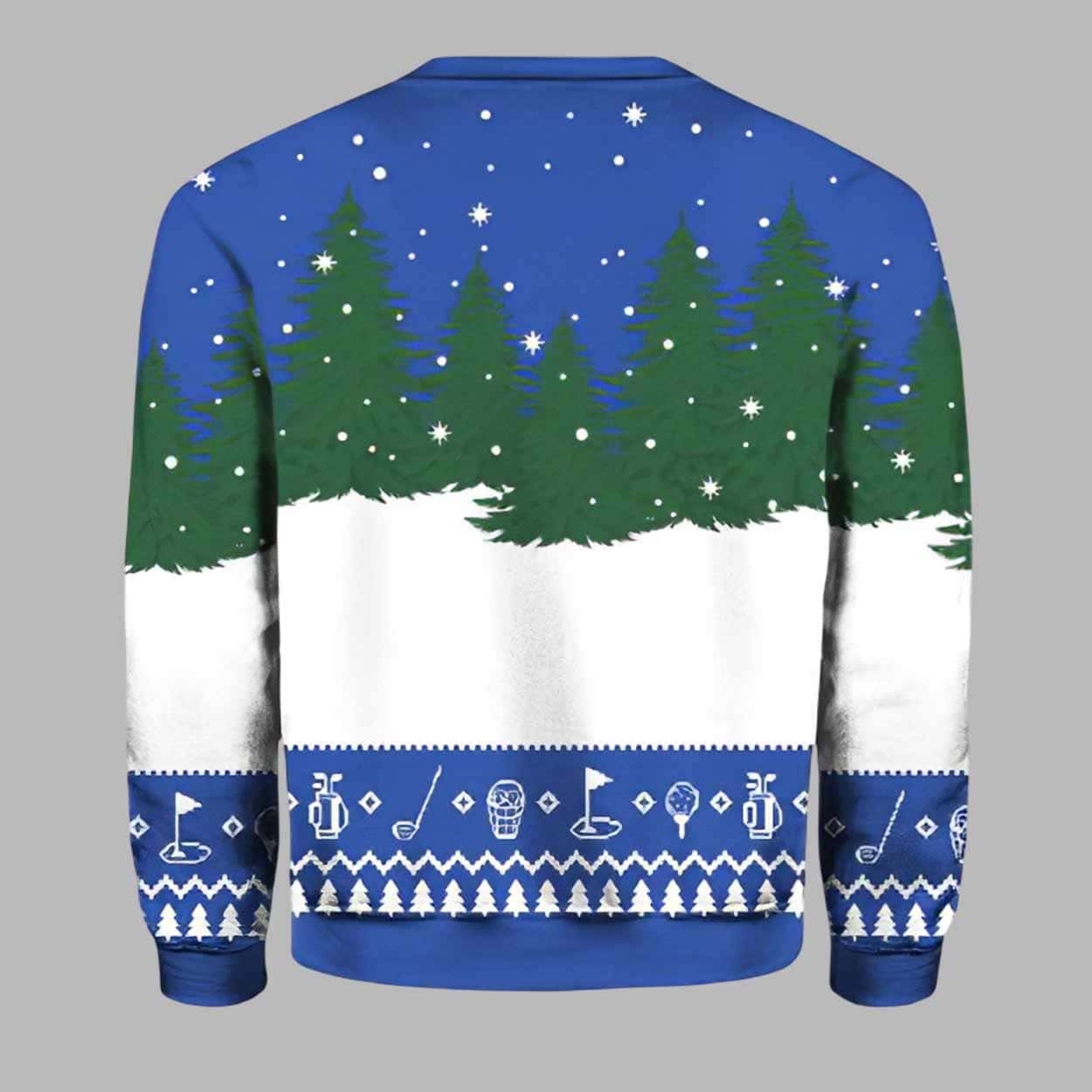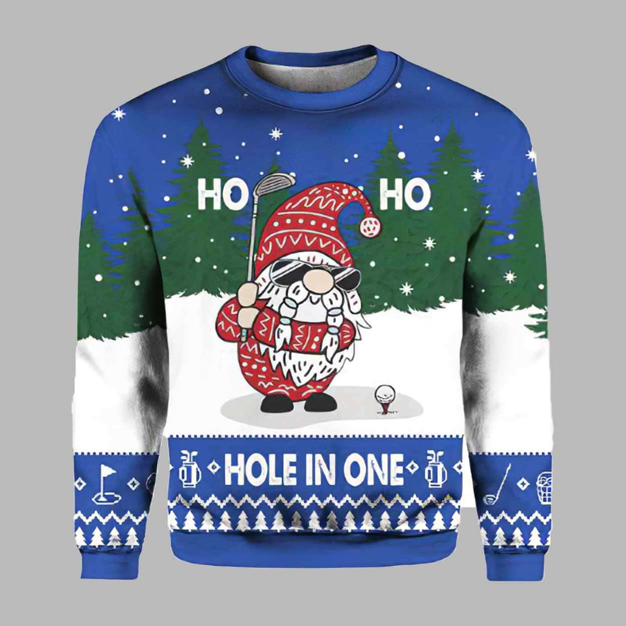 The ugly christmas sweater features an adorable Santa gnome holding a golf club, set against a wintry forest background with snowflakes falling softly. The bold text āHO HO HOLE IN ONEā adds a clever pun that perfectly blends golf humor with holiday cheer. The design is detailed with small golfing iconsāclubs, balls, and flagsāwoven into the pattern, creating a fun, sporty look that stands out at any Christmas event.