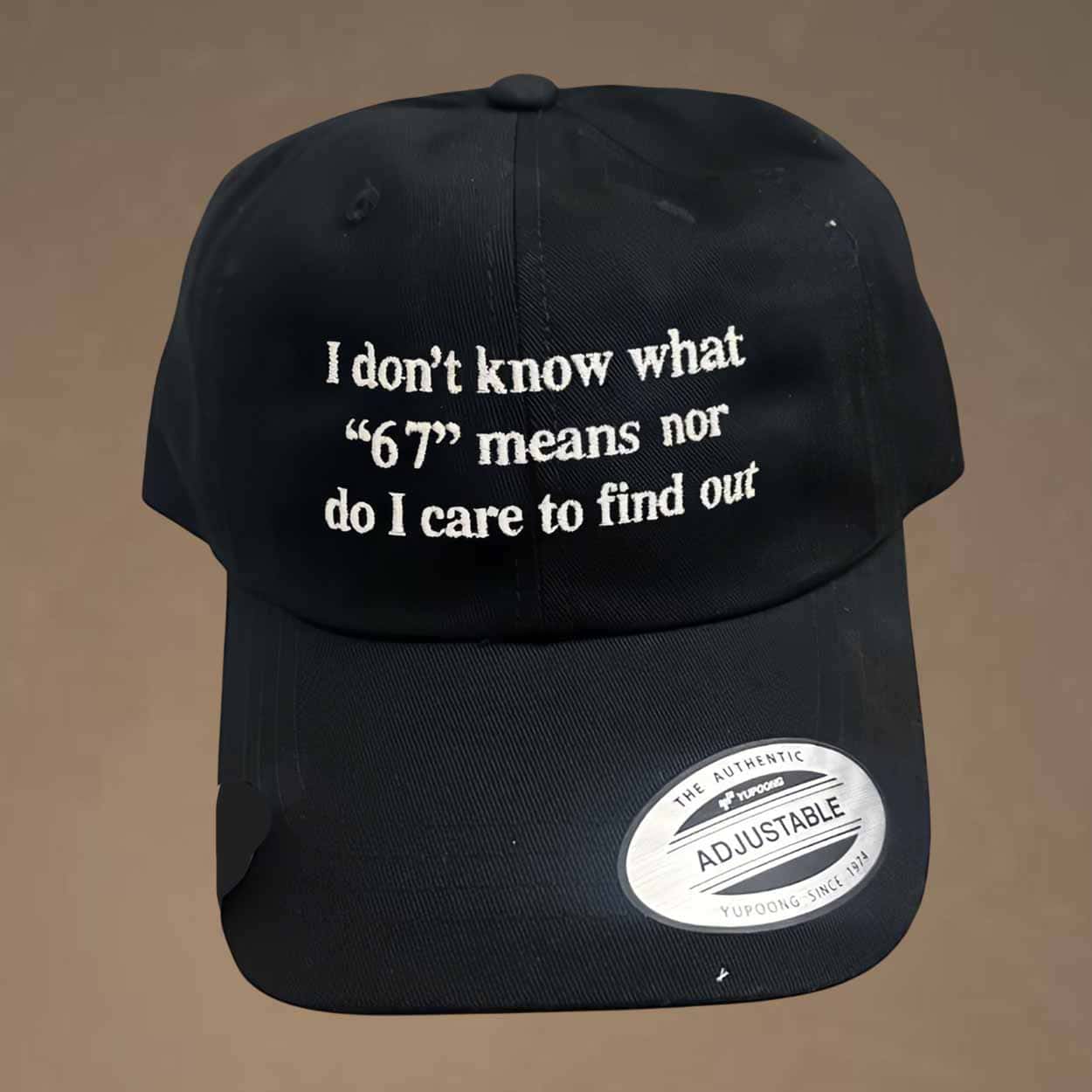 Sometimes the best way to make a statement is with humor and a little mystery. The I Don’t Know What 67 Means Nor Do I Care To Find Out Hat is the perfect accessory for those who love witty fashion and aren’t afraid to show off their personality. With its clever embroidered text, this hat will grab attention, spark conversations, and make people smile without you saying a word.