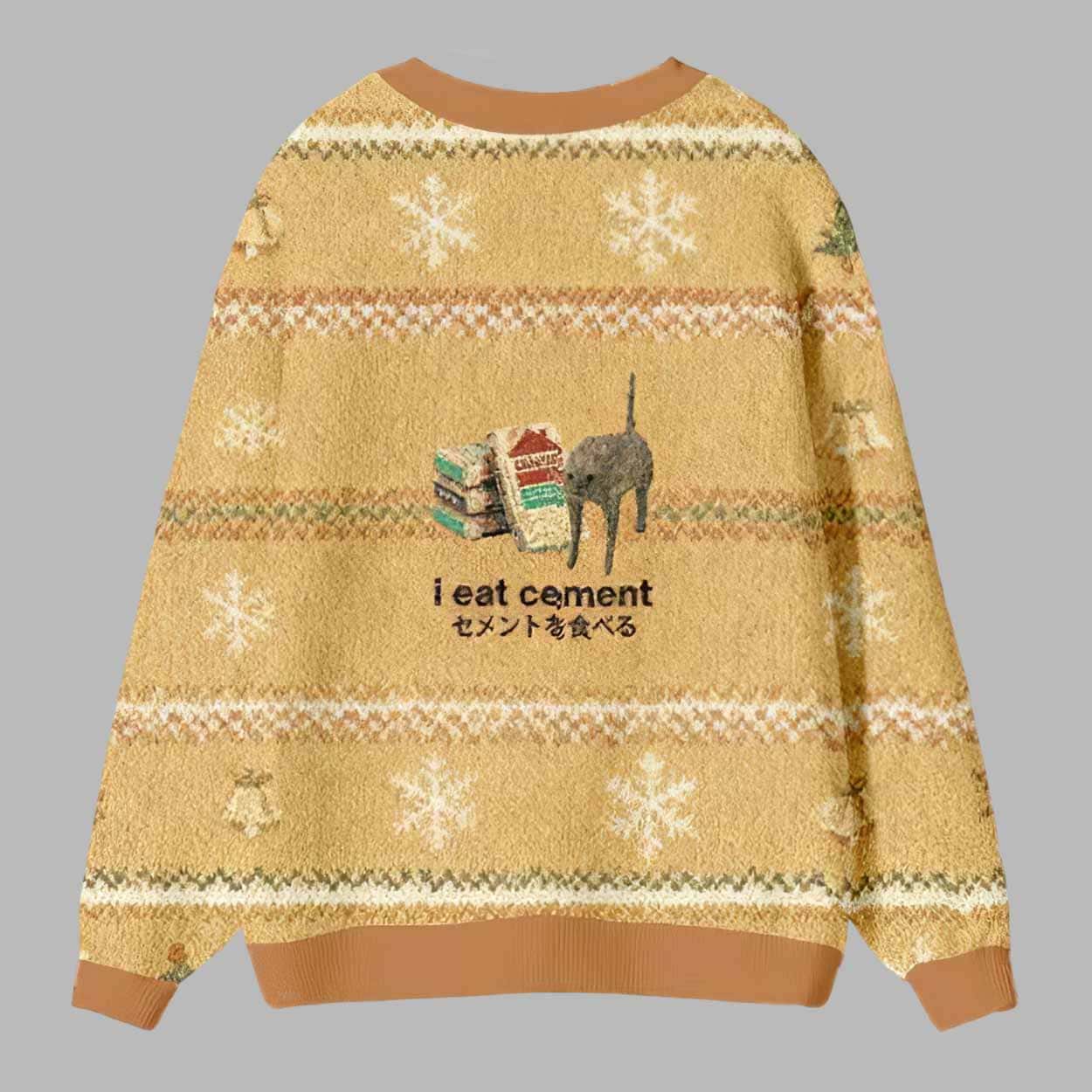 The ugly cardigan sweater is crafted from a soft and cozy fabric, offering the warmth you need for winter while keeping you comfortable throughout the day. The light tan color provides a neutral backdrop for the unique and eye-catching design. The sweater features a playful graphic of a cat standing next to cement bags, accompanied by the phrase āI eat cementā in English and Japanese, adding a fun, whimsical element to this holiday-ready piece.