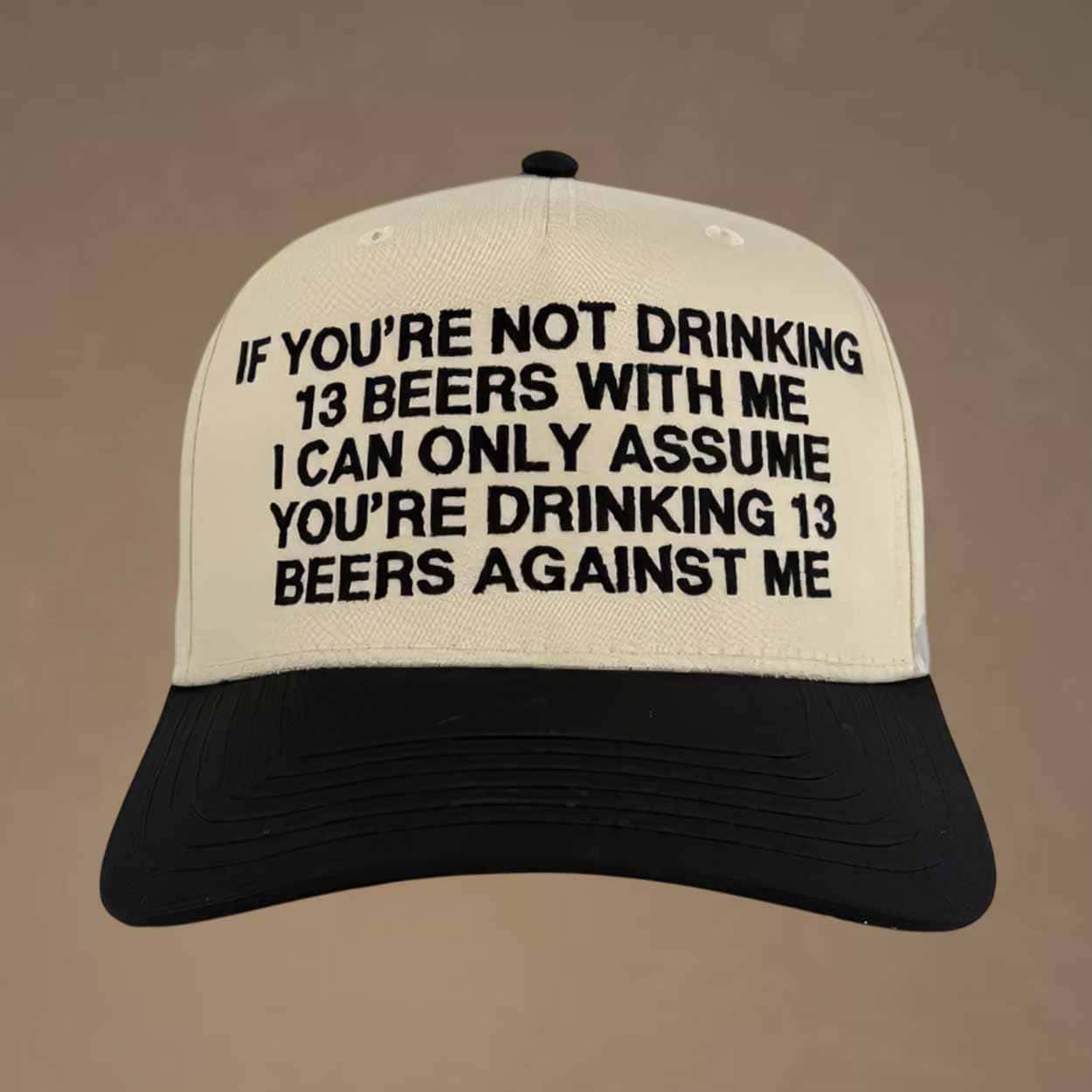 This cap combines comfort and style with a two-tone design: a cream-colored crown and a contrasting black brim. The front is embroidered with bold black lettering that proudly declares, “If you’re not drinking 13 beers with me, I can only assume you’re drinking 13 beers against me.” The stitched design ensures long-lasting durability while giving the cap a premium, standout look.