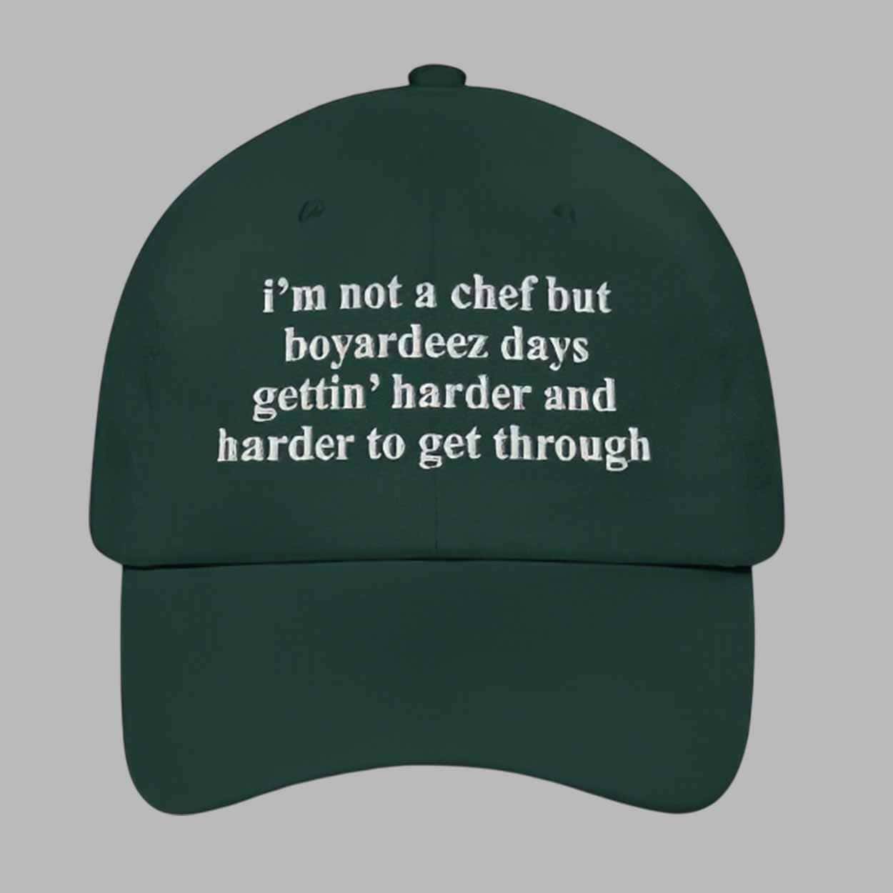 A dose of humor to your style with the I’m Not A Chef But Boyardeez Days Getting Harder And Harder To Get Through Hat. This witty and relatable hat captures the feeling we’ve all had — those long days that just seem to get tougher. Perfect for anyone who appreciates wordplay and clever design, this hat is more than just a piece of apparel; it’s a statement of resilience wrapped in humor.