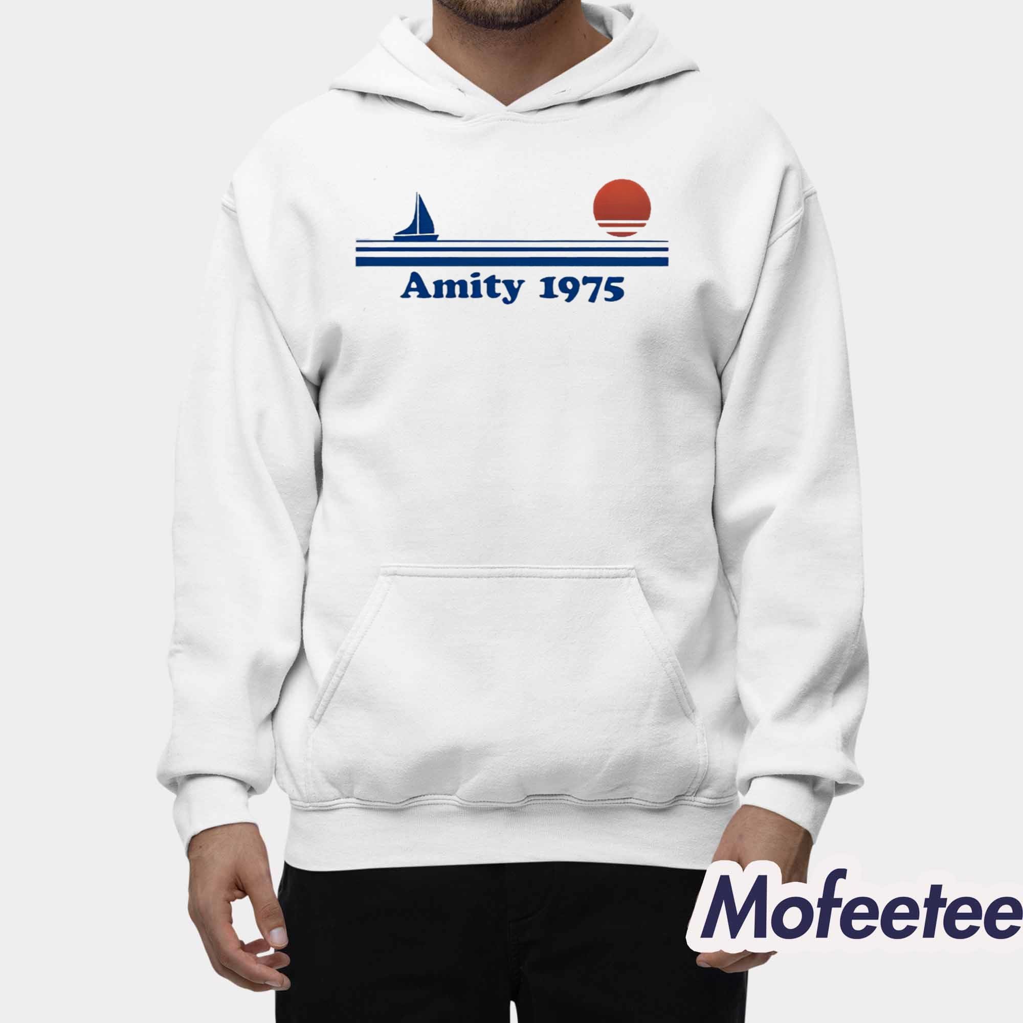 The shirt features a clean, minimalist design inspired by the iconic seaside setting of Amity Island. With a small sailboat, a setting sun, and the text “Amity 1975,” this shirt instantly transports you back to the summer when one of the greatest thrillers of all time made its mark on cinema history. Its timeless design makes it perfect for casual outings, movie nights, or as a conversation starter among fellow Jaws fans.