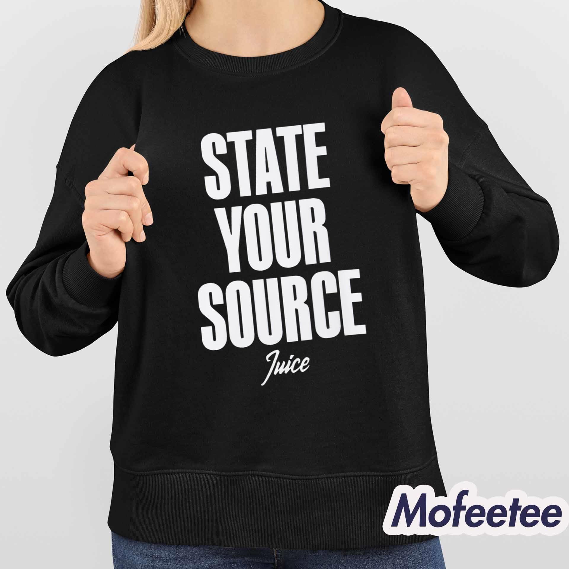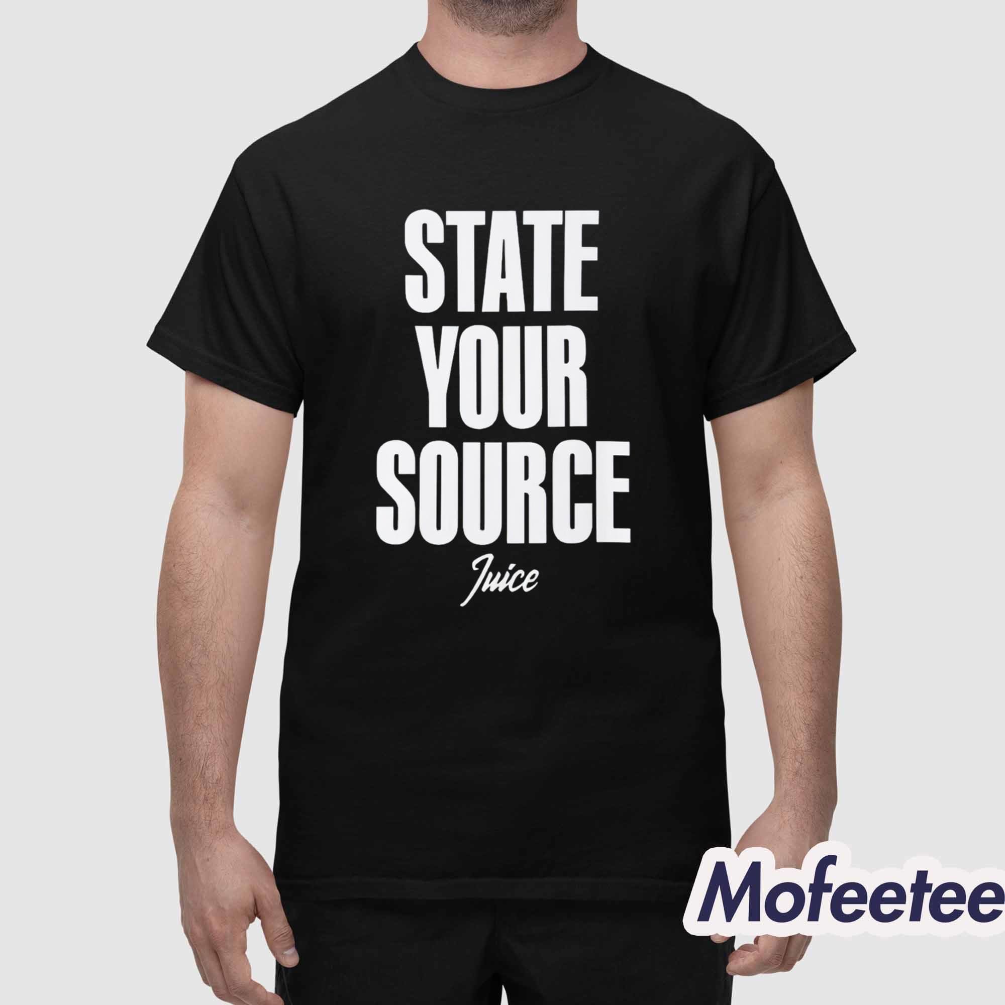 This shirt showcases bold, vertical typography that immediately catches the eye. The phrase “State Your Source” stands tall and direct, while the subtle “Juice” script underneath adds balance and character to the overall design. The contrast between the crisp white text and deep black fabric creates a sharp, timeless look that never feels dated.