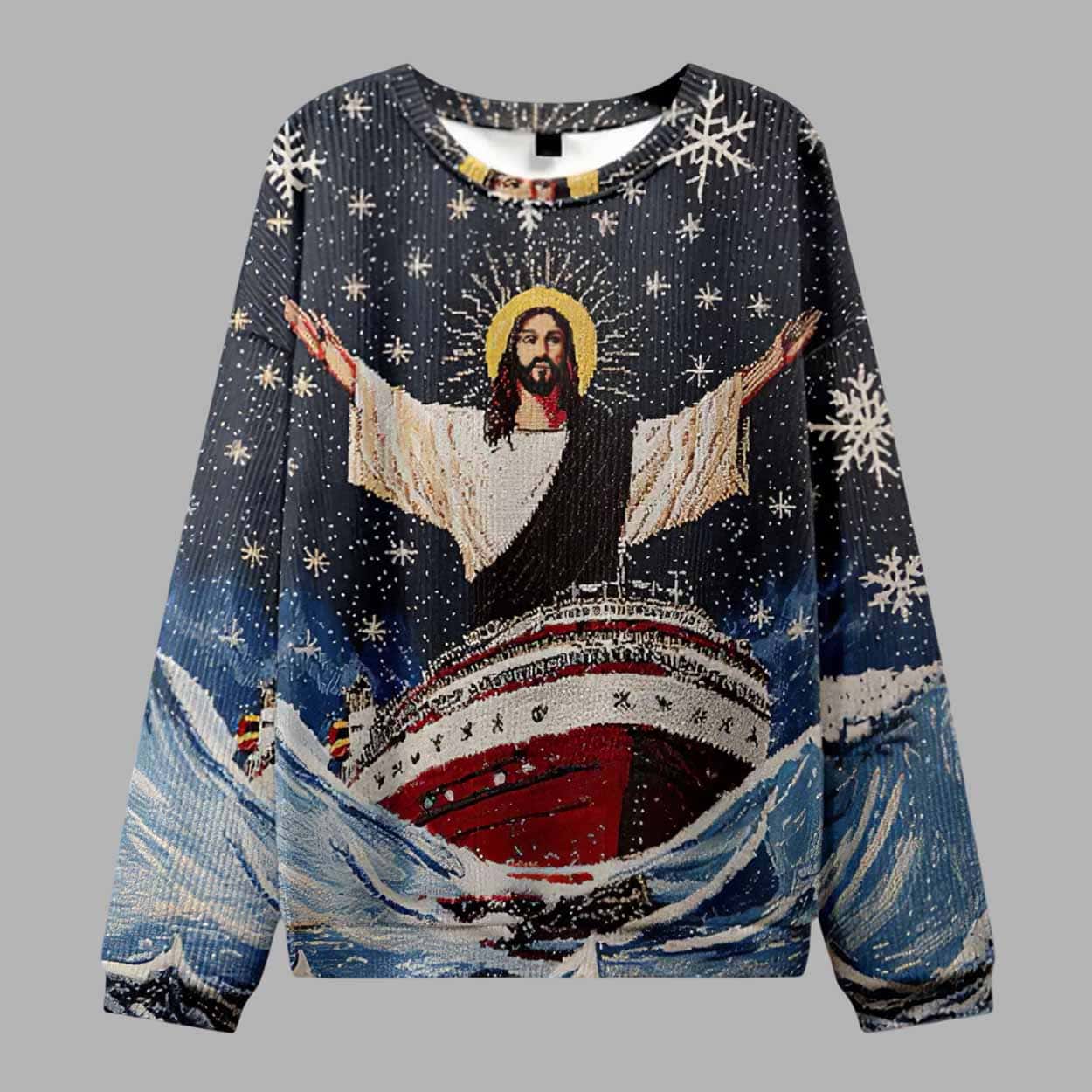The sweater features a vibrant, all-over graphic of Jesus with arms wide open, standing confidently atop a detailed cruise ship riding waves under a snowy night sky. Large snowflakes scattered across the design bring a seasonal touch that ties it perfectly into Christmas festivities. The long sleeves, ribbed cuffs, and crew neck design add extra comfort and durability, ensuring it remains a staple piece for many holiday seasons to come.