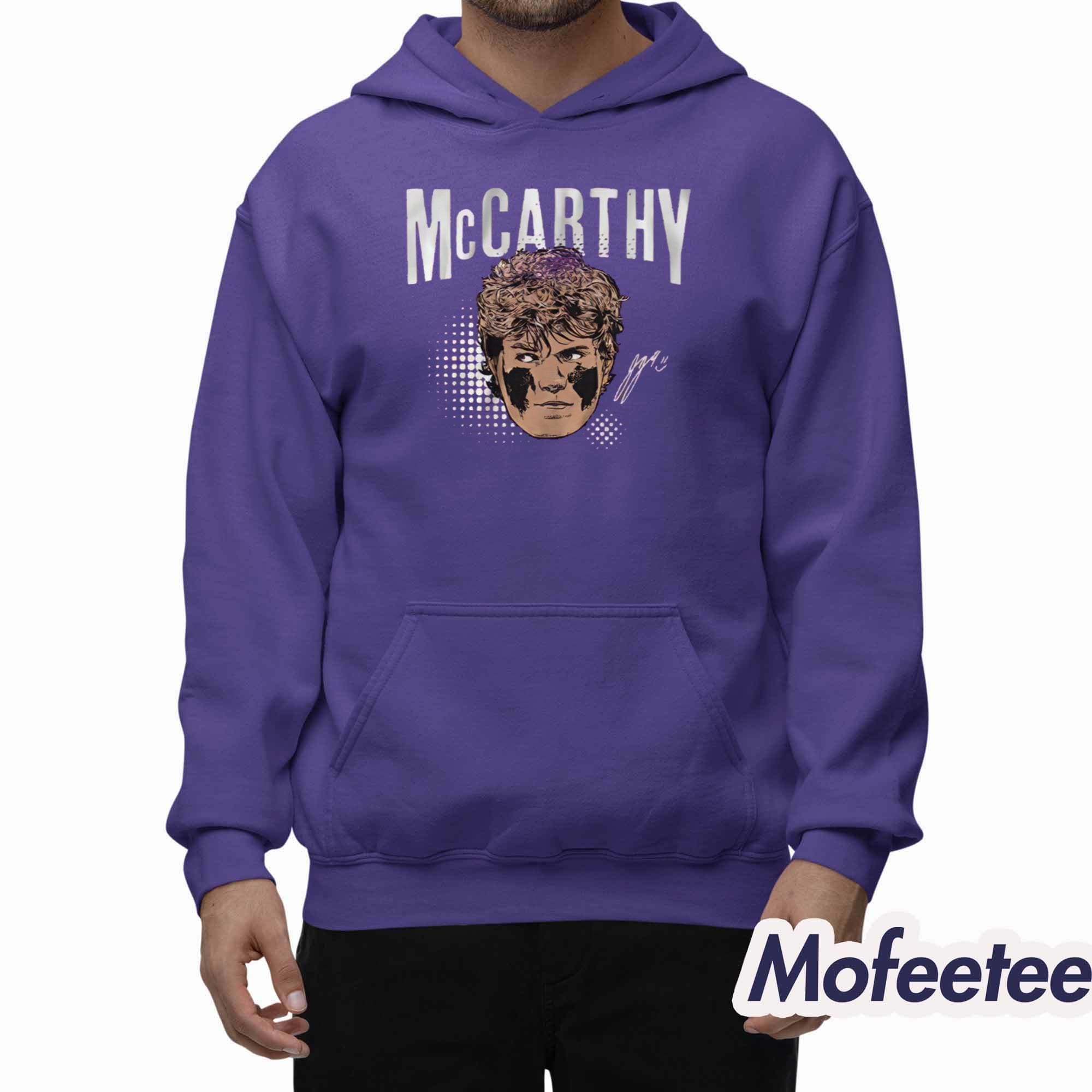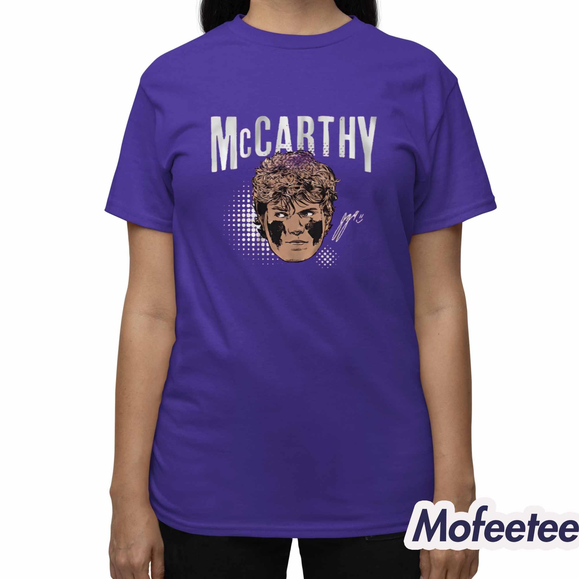 The shirt is made of soft, high-quality cotton that ensures comfort all day long. The purple shirt features a vibrant graphic of JJ McCarthy’s face with football eye black and his bold name in a stylized font. The artistic design is modern and sporty, with a touch of swag that makes it stand out. The shirt is perfect for casual wear, watching games, or representing your team wherever you go.