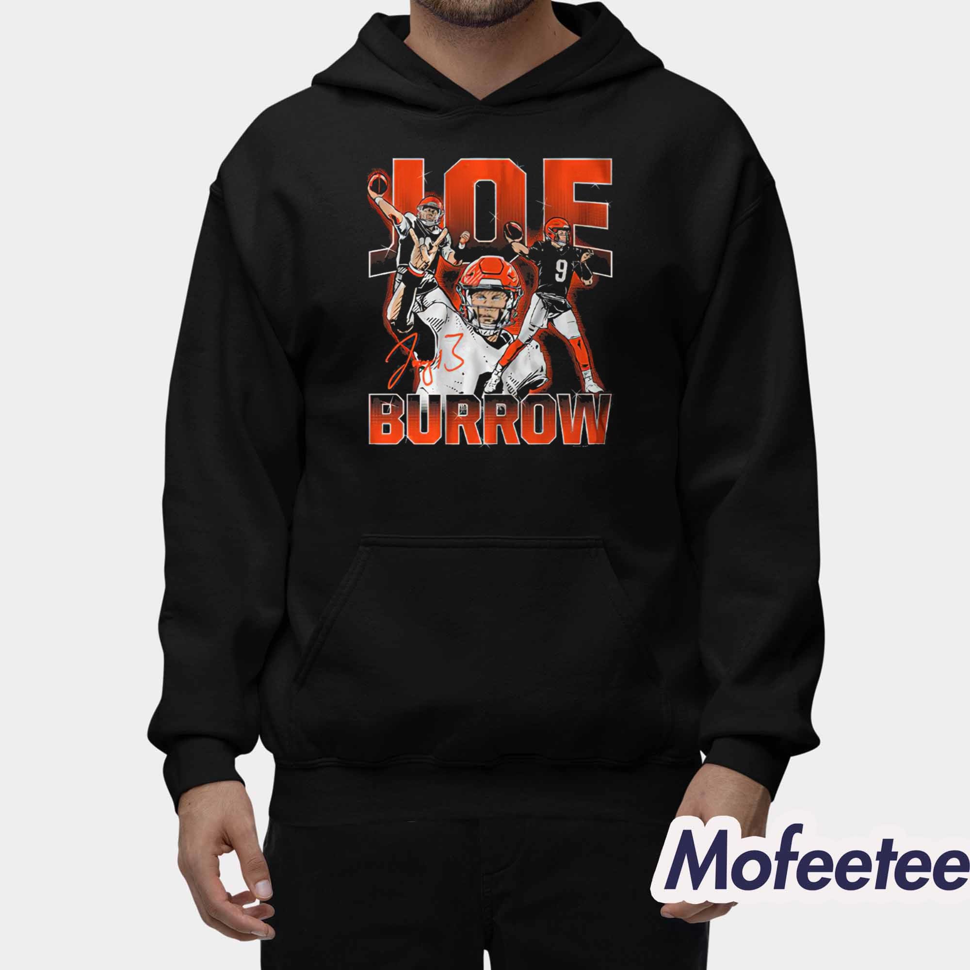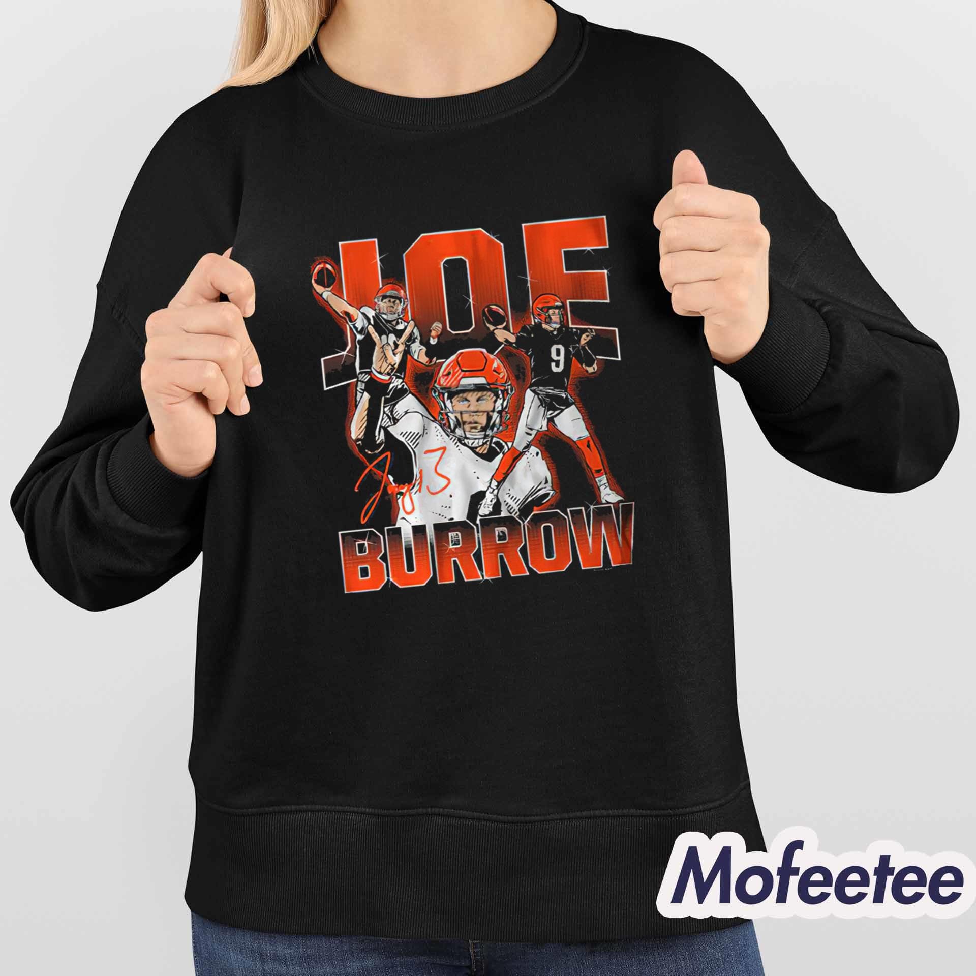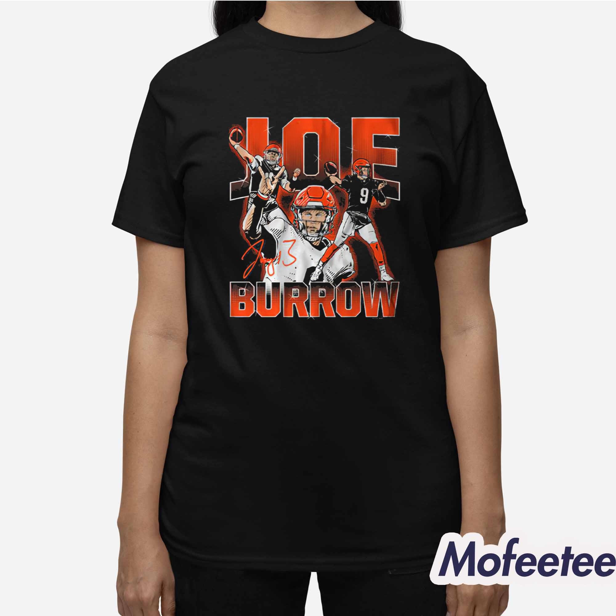 The shirt is made from high-quality cotton, offering both comfort and durability for all-day wear. The black shirt serves as the perfect backdrop for the dynamic graphic of Joe Burrow in action. The artwork captures the energy and excitement of Burrow’s gameplay, complete with his iconic number 9 jersey. His strong presence on the field is brought to life through the detailed, vibrant illustration, which showcases him in his prime.