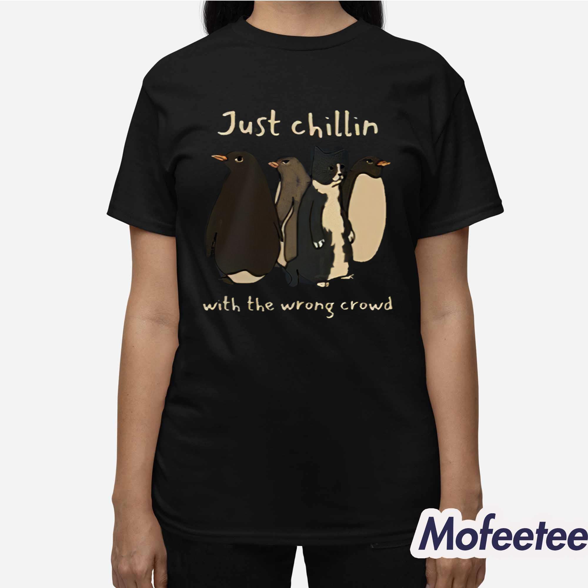 The shirt features a unique and playful graphic: a serious-looking cat confidently standing among a group of penguins with the phrase “Just chillin with the wrong crowd.” The design pops against the deep black background, creating a humorous and visually appealing contrast that will draw attention in the best way.