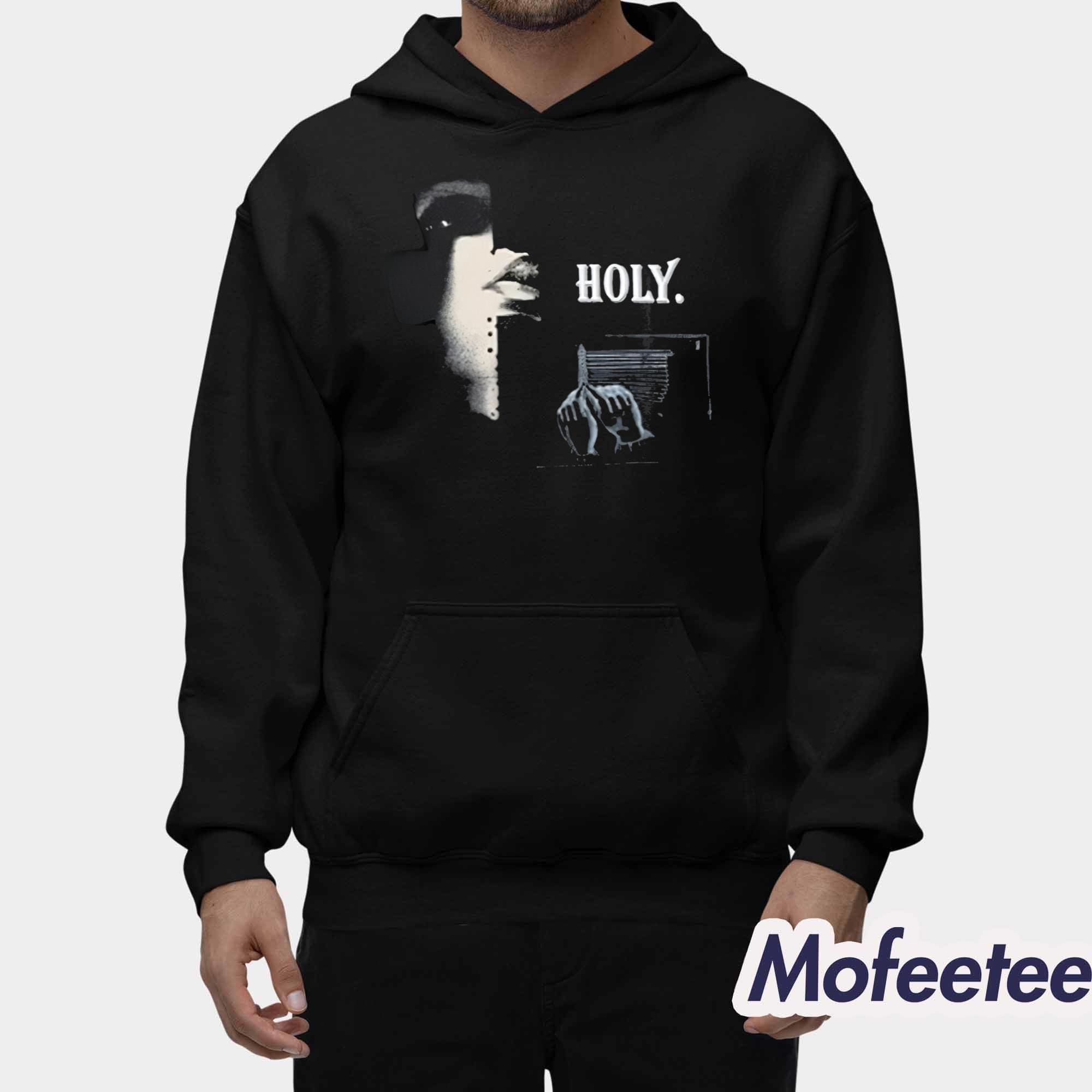 The shirt features an eye-catching design that embodies both the artist’s unique style and the message of his music. The front of the shirt showcases a powerful graphic featuring hands with the word “HOLY” printed alongside it, creating a strong visual connection to the song and its themes of faith, reflection, and a desire for positivity in the world.
