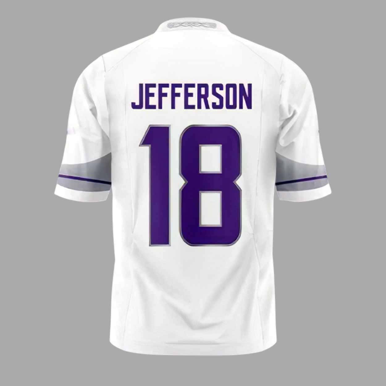 The jersey features the signature Vikings wordmark across the chest, along with Jefferson’s iconic number 18 printed in bold purple outlined with metallic accents. The back showcases his full surname “JEFFERSON,” ensuring your favorite receiver is represented from every angle.