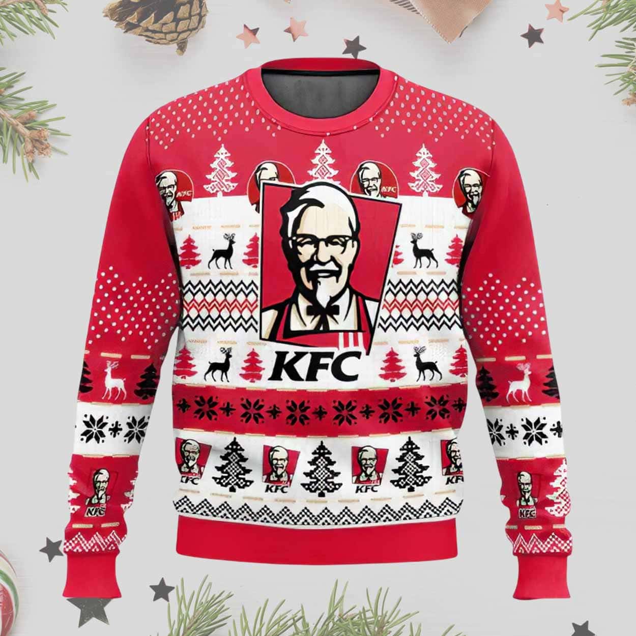 The ugly christmas sweater is a vibrant red sweater adorned with festive designs, including reindeer, Christmas trees, and, of course, multiple renditions of Colonel Sanders’ face. The playful mix of holiday patterns with the beloved KFC branding gives this sweater a quirky, humorous twist that will bring smiles to your family gatherings, parties, or movie marathons.