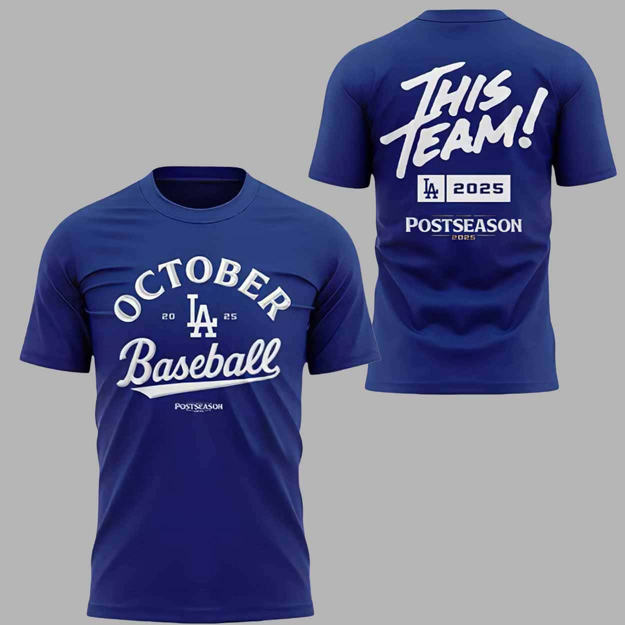On the front of the shirt, the design features “October Baseball 2025” in striking white letters, with the Dodgers logo displayed prominently. The back of the shirt keeps the energy high with the exclamation “THIS TEAM!” along with “POSTSEASON 2025,” showing your unwavering support for the Dodgers as they chase their dreams in October. The shirt is available in a classic blue color, perfectly matching the team’s iconic hues.