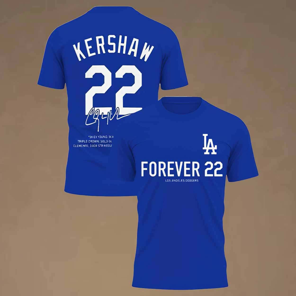 This shirt features a clean, timeless design that captures the spirit of Clayton Kershaw’s career. The front proudly displays the phrase “FOREVER 22” alongside the iconic LA logo, representing Kershaw’s unwavering dedication to the Dodgers. On the back, his name “KERSHAW”, number 22, and signature are printed in bold white — a lasting tribute to his legacy. Beneath the number, highlights of his remarkable achievements, including 3x Cy Young, MVP, Triple Crown, and World Series Champion, remind fans why he’ll always be remembered as one of the greatest to ever take the mound.
