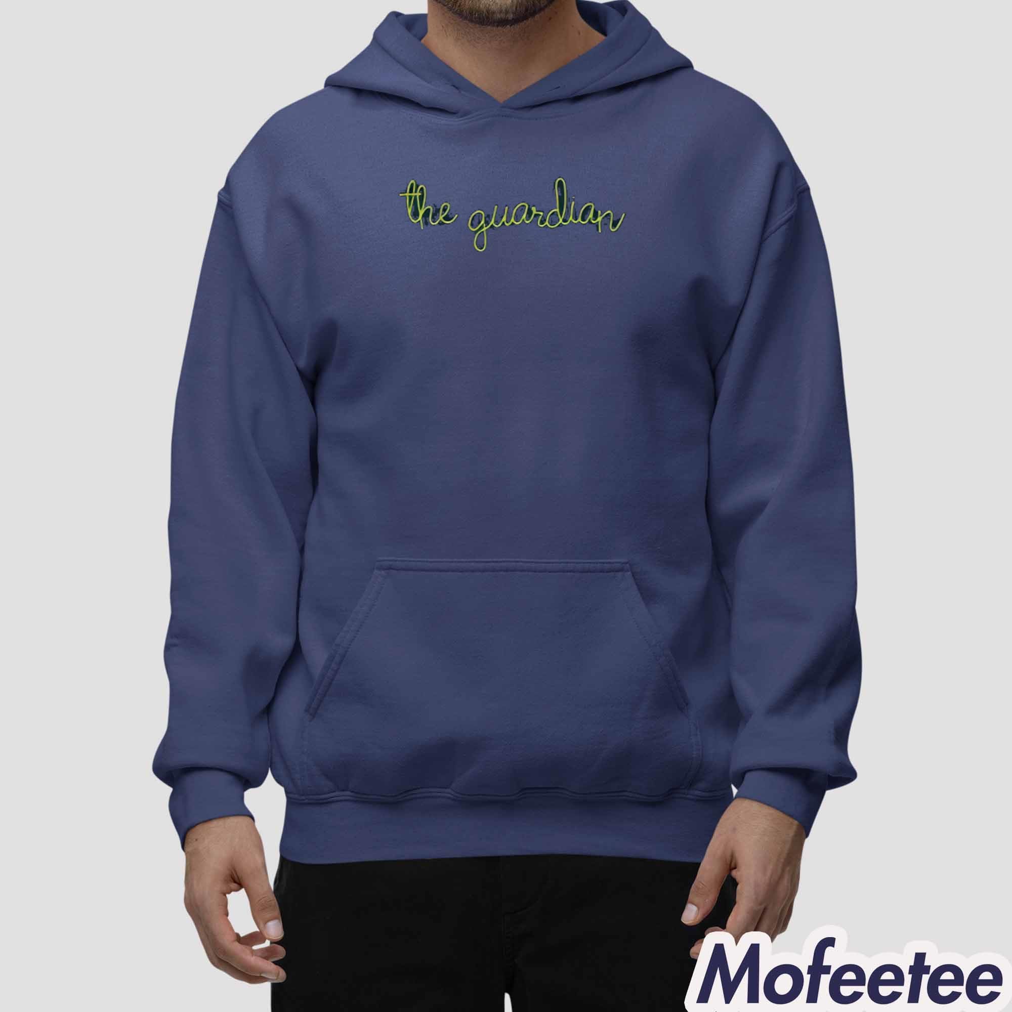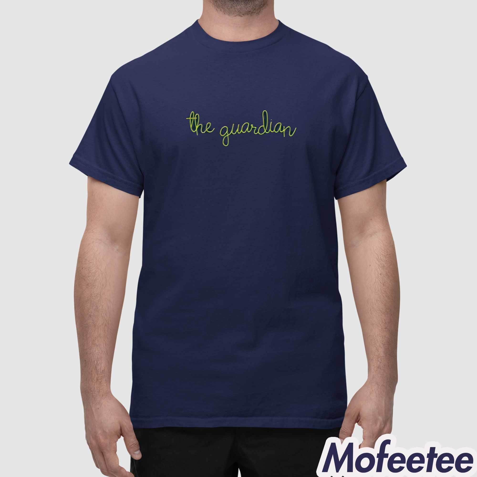 The shirt is made from a soft, breathable cotton blend that ensures comfort throughout the day. The navy blue color provides a clean, sophisticated backdrop, making the green script design stand out. The unique, cursive lettering of “the guardian” adds a personal and artistic touch, ideal for those who want to showcase their style and individuality.