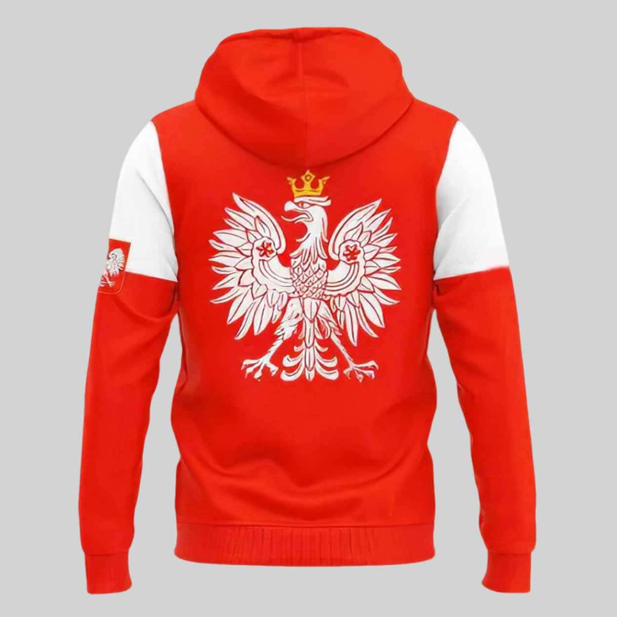 The hoodie features a striking red and white design, symbolizing the Polish flag. The front showcases the Mariners team name in bold white lettering, complemented by the Polish flag on the sleeve. The back features a large, detailed design of the Polish eagle, crowned with a regal touch, signifying the country’s proud heritage. The hoodie is designed to celebrate both the Mariners and Polish culture, creating a unique and stylish piece for fans of all backgrounds.