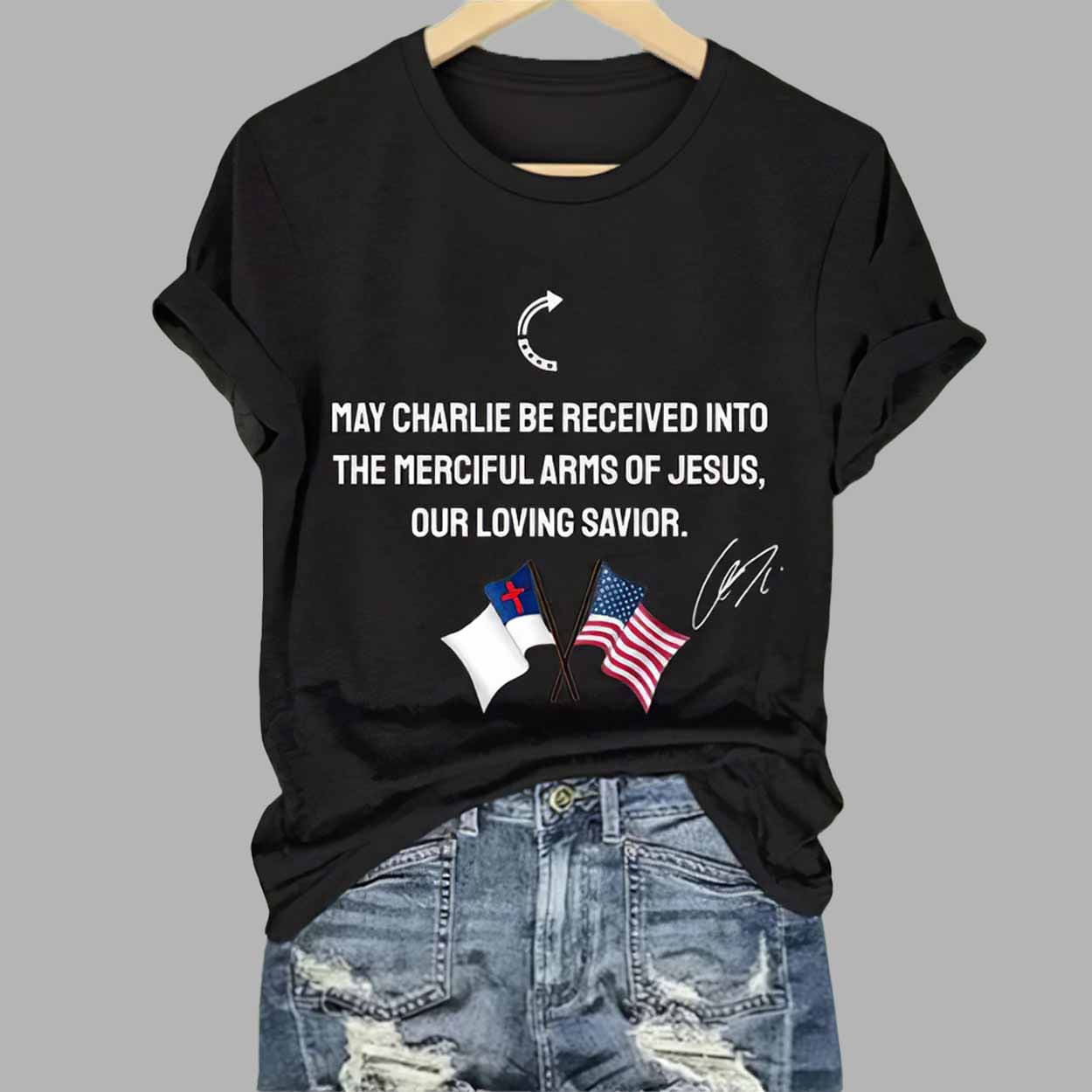 Crafted from soft, high-quality cotton, the shirt is both comfortable and durable. The design includes a meaningful message: “May Charlie be received into the merciful arms of Jesus, our loving savior.” It’s paired with images of the Christian and American flags to further emphasize patriotism and faith.