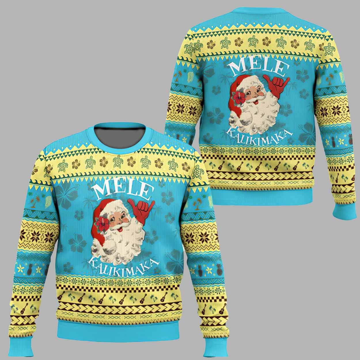 The soft fabric ensures you stay warm during the colder months while providing a breathable and cozy feel for long holiday days. The front and back feature the words “Mele Kalikimaka,” meaning “Merry Christmas” in Hawaiian, accompanied by a retro Santa figure sporting a red hat and the classic shaka hand gesture. The bright blue background, paired with festive yellow, red, and green accents, gives the sweater a vibrant, fun look that’s perfect for spreading holiday cheer.