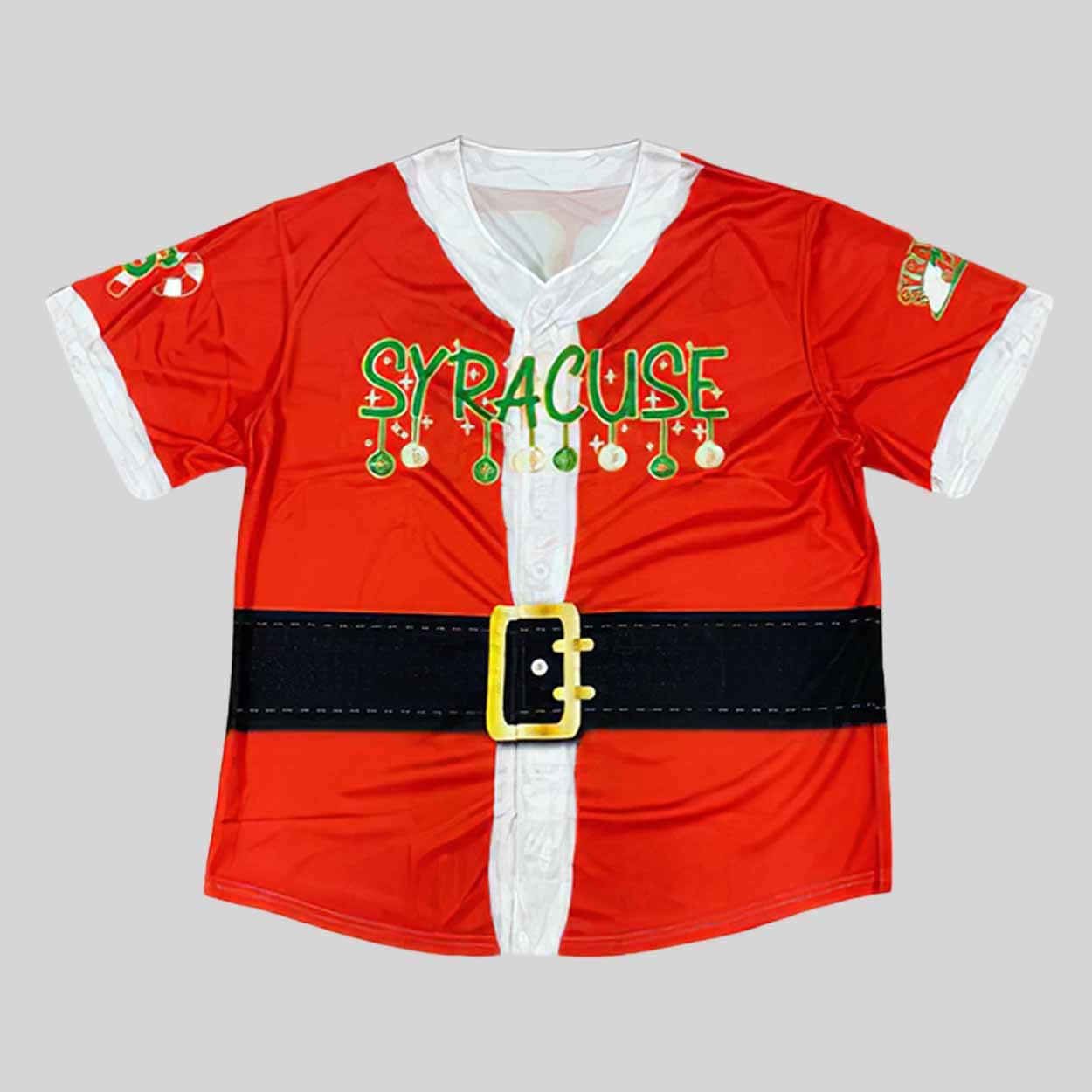 Designed to make fans smile from bleacher to dugout, the jersey 2025 giveaway is a playful, Santa-inspired piece that captures the spirit of the holidays with standout detail. The front of the jersey features a bright red base styled like Santa’s coat, complete with a printed white trim, decorative buttons, and a bold black belt with a yellow buckle. The word “SYRACUSE” is spelled out in fun green ornament lettering, adding an extra touch of holiday flair.