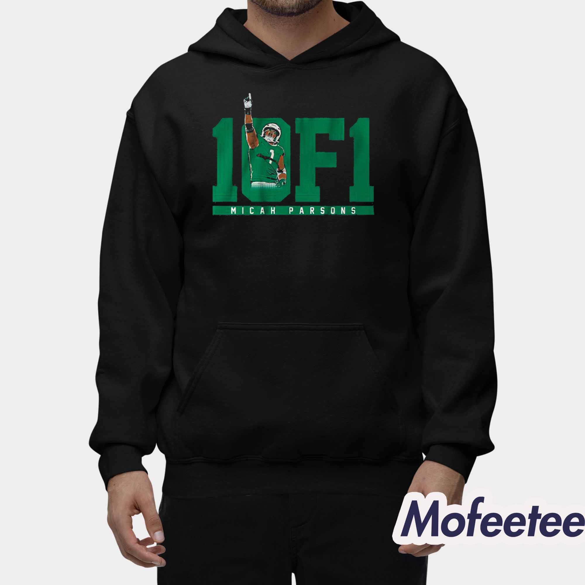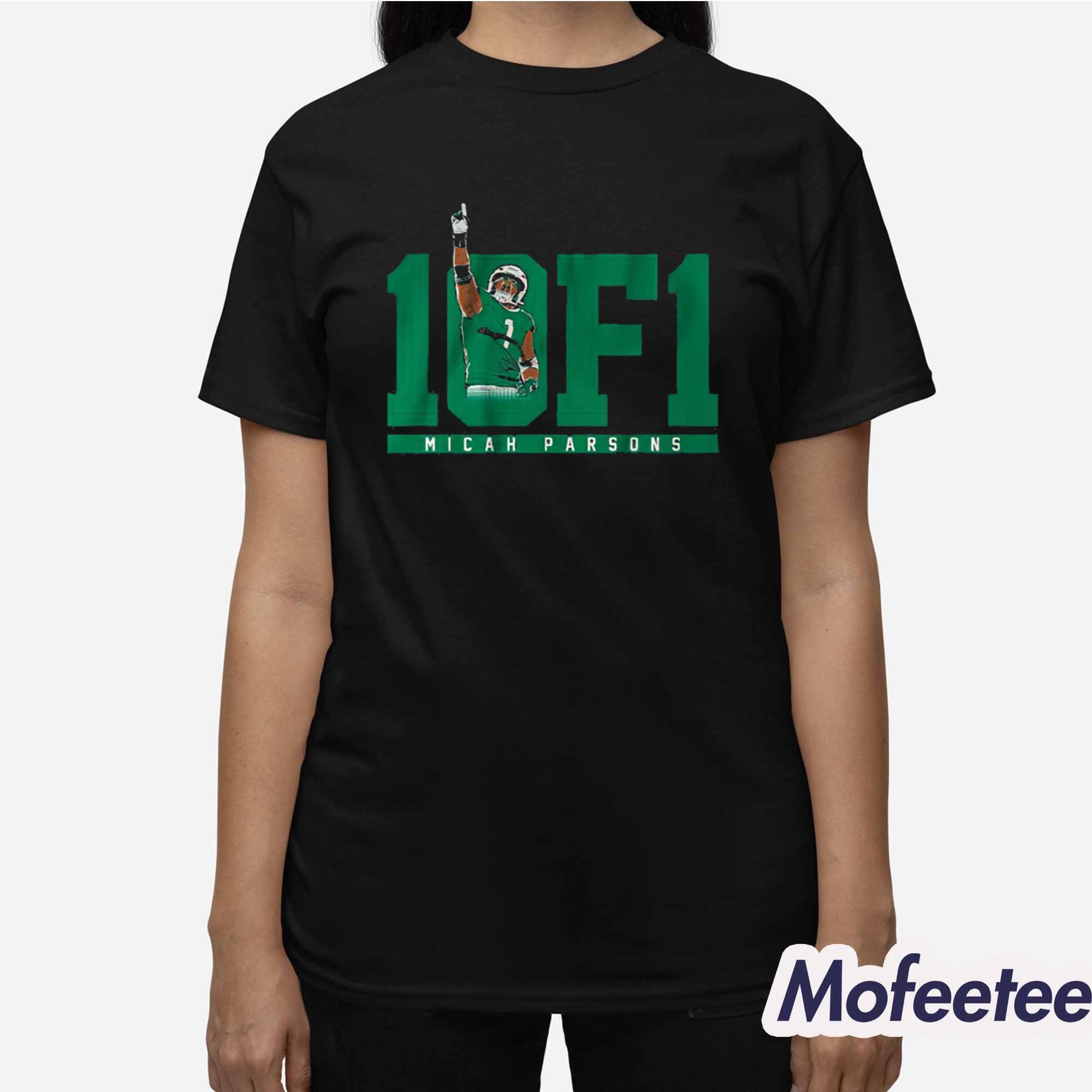 The shirt features a bold design with the number “11” and the phrase “1 OF 1” displayed in striking green lettering, symbolizing Micah’s unique and unmatched skill. Below the text, the shirt showcases an action-packed image of Micah Parsons in his signature pose, with his arm raised in triumph. The design is powerful and captures the essence of Micah’s determination on the field.