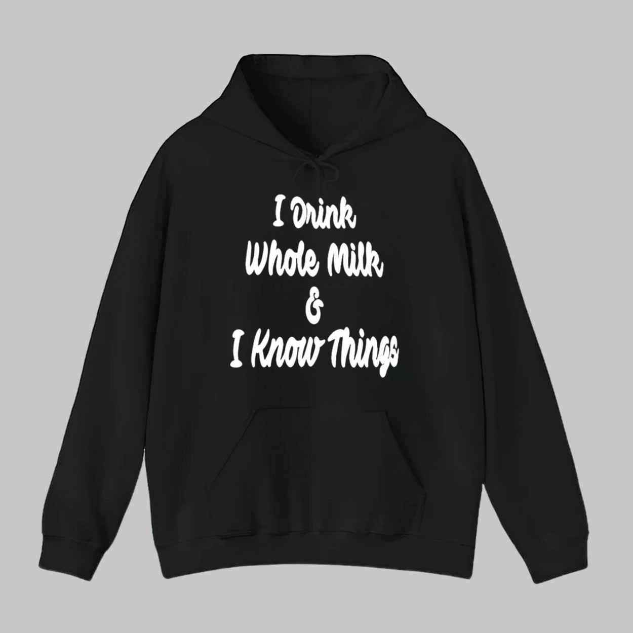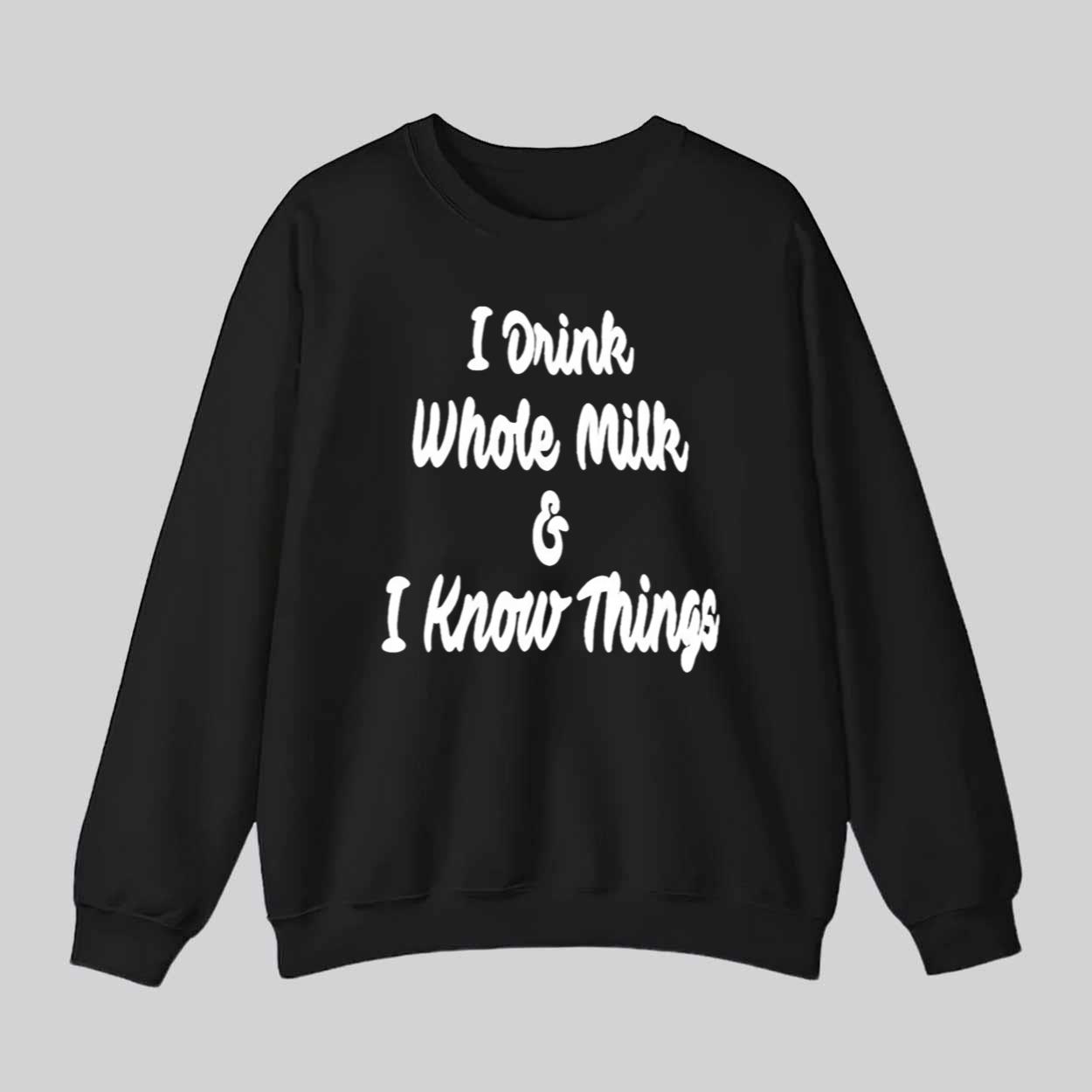What sets this shirt apart is its clever message: “I Drink Whole Milk And I Know Things.” This eye-catching statement is both humorous and relatable, appealing to those who appreciate sharp wit and a touch of confidence. Perfect for fans of clever slogans and minimalistic designs, this shirt delivers both style and charm.