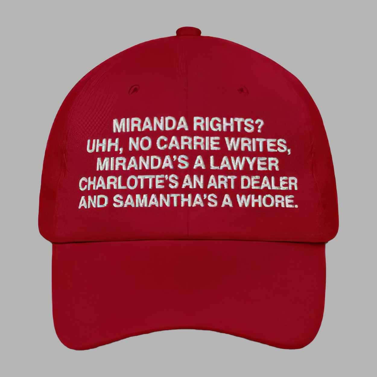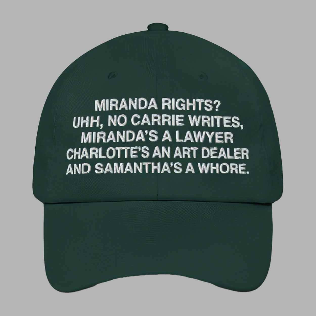 For fans who want to stand out with confidence and wit, the Miranda Rights Uhh No Carrie Writes Miranda’s A Lawyer Charlotte’s An Art Dealer And Samantha’s A Whore Hat is the ultimate accessory. With its durable construction, adjustable fit, and bold embroidered design, this hat makes a stylish and humorous addition to any wardrobe.