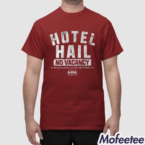 The shirt features a fun and memorable graphic that combines a vintage hotel sign with the spirit of Mississippi State University. The bold “HOTEL HAIL” and “NO VACANCY” text creates a statement that resonates with fans who are always ready to support their team. Below the main design, the shirt reads: “We hope you enjoy your stay in beautiful Starkville, MS!”—a perfect touch for those who love the Bulldogs and their home turf.