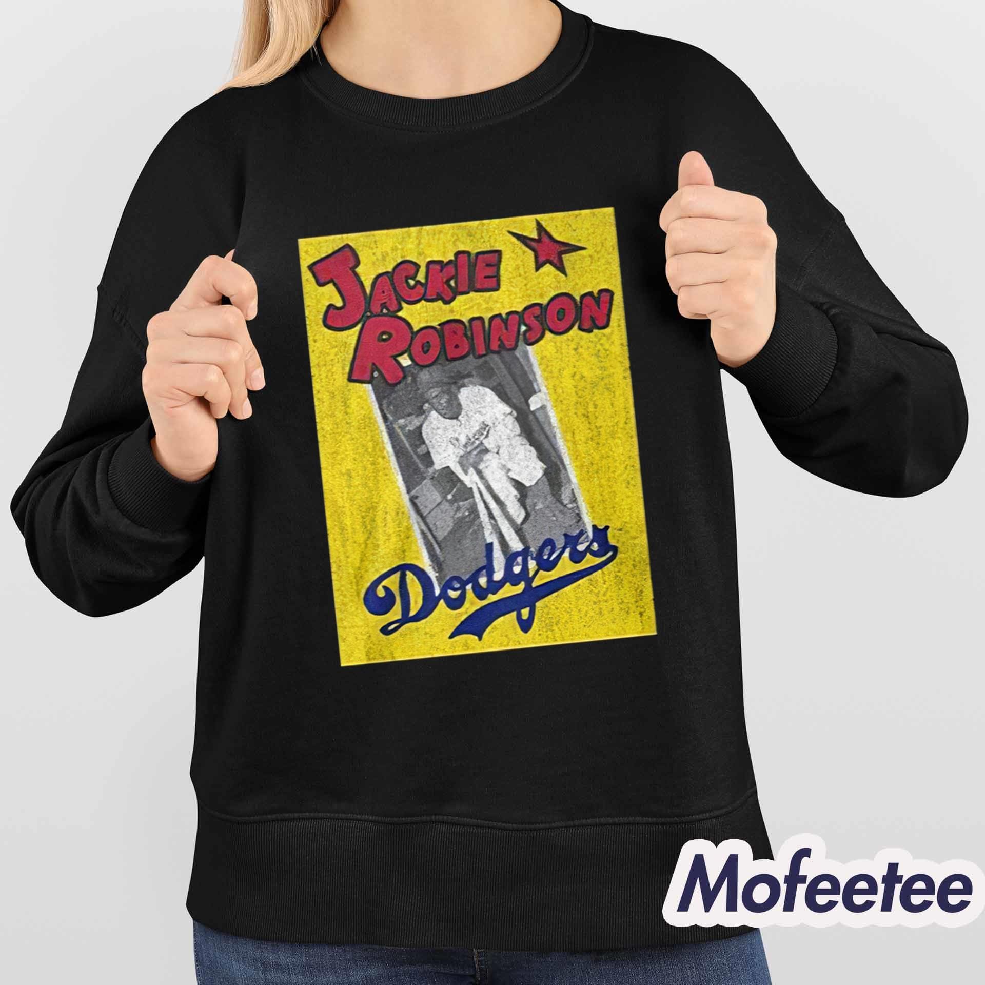 The shirt features a throwback design that mirrors a classic baseball card, with Jackie Robinson in his Dodgers uniform captured in black and white, framed by a distressed yellow backdrop. The bold red “Jackie Robinson” text and the vintage “Dodgers” script in blue make the graphic pop on a sleek black tee.