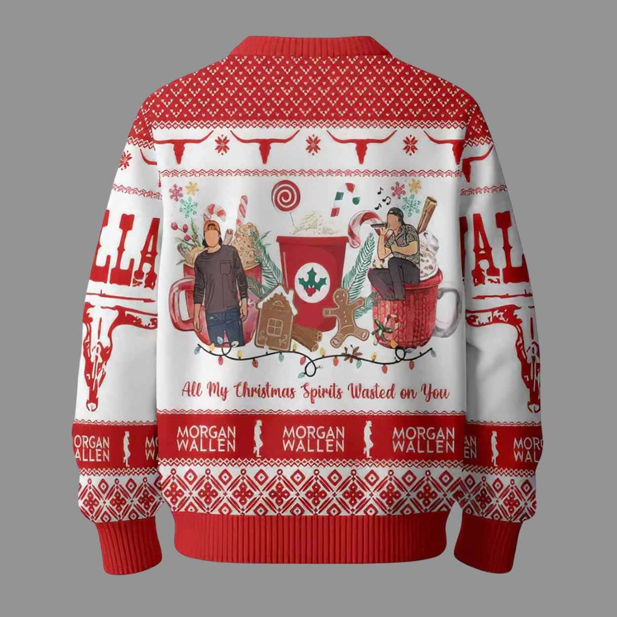 This ugly christmas sweater is designed for comfort and style, making it an excellent choice for casual gatherings, family events, or just lounging around during the holiday season. The design captures the fun spirit of Christmas with a creative twist, showcasing Morgan Wallen in a cheerful holiday-themed artwork. The front of the sweater features a striking image of the country music star, surrounded by festive elements like Christmas trees, ornaments, and candy canes. On the back, you’ll find the fun lyrics āAll My Christmas Spirits Wasted on Youā displayed in a festive font, adding a humorous touch to your holiday wardrobe.