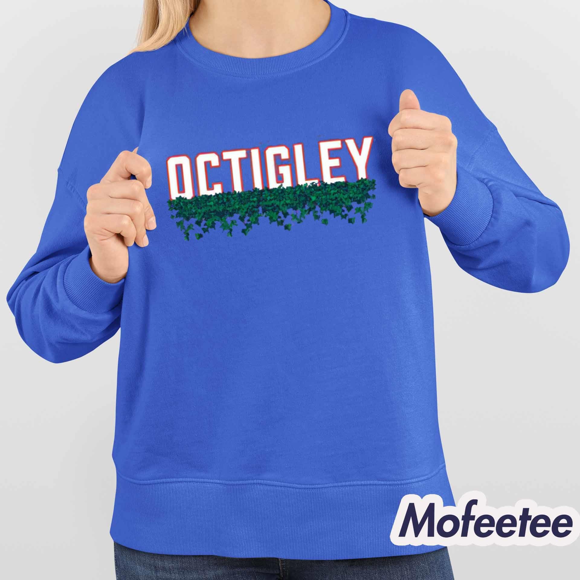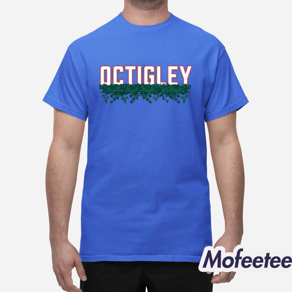 The shirt features a clean, bold design with the word “Octigley” spelled out in large, eye-catching letters. The letters are topped with an ivy design, adding a fun, visually interesting twist. This unique design ties in with the sports world while giving a nod to the humor and personality that the podcast is known for.