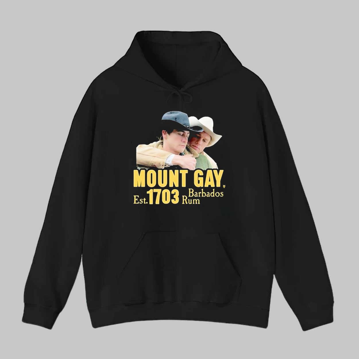 The front features a vibrant design with cowboy imagery, accompanied by the words “Mount Gay Barbados Rum Est 1703” in bold lettering. The high-quality print ensures durability, maintaining its color and sharpness even after multiple washes.
