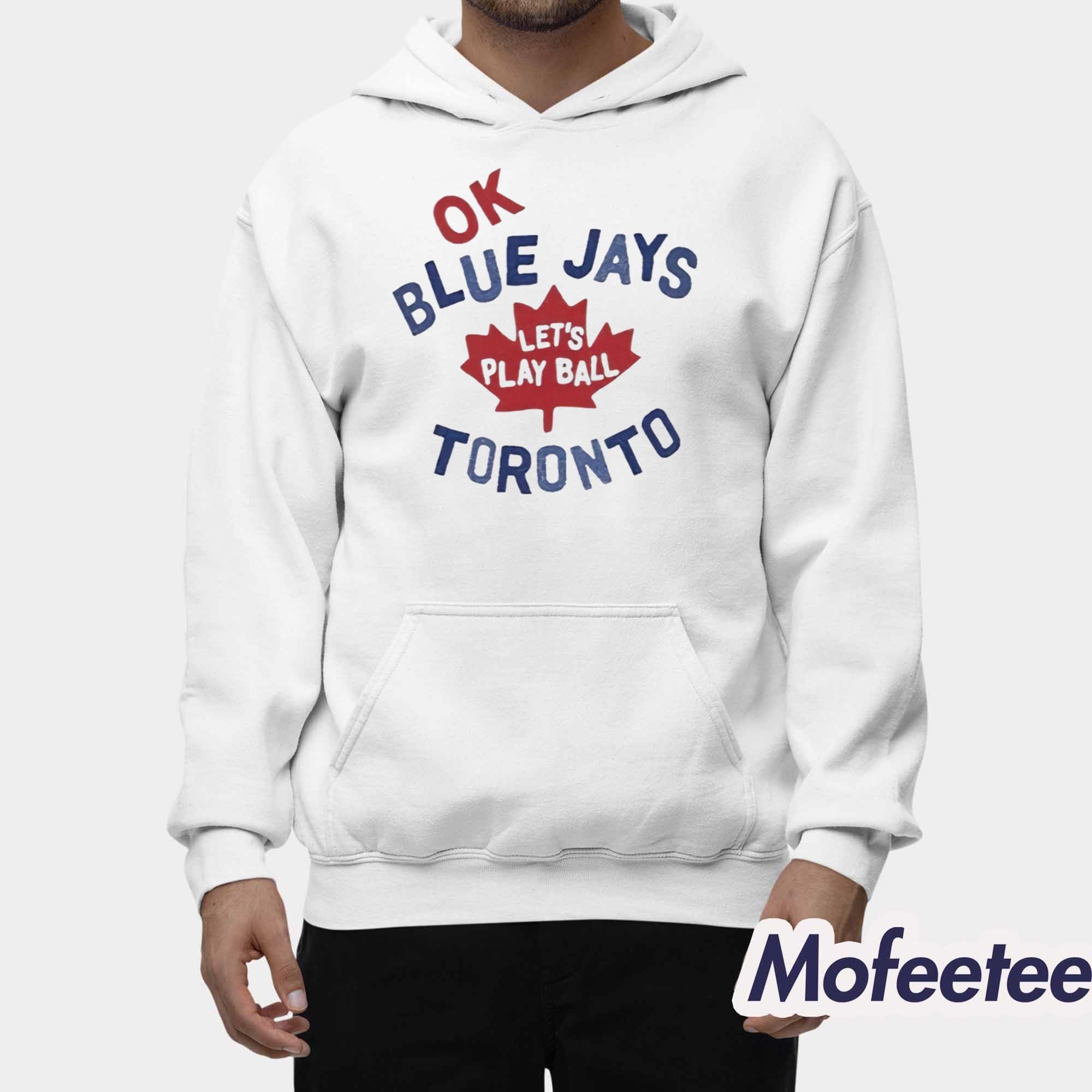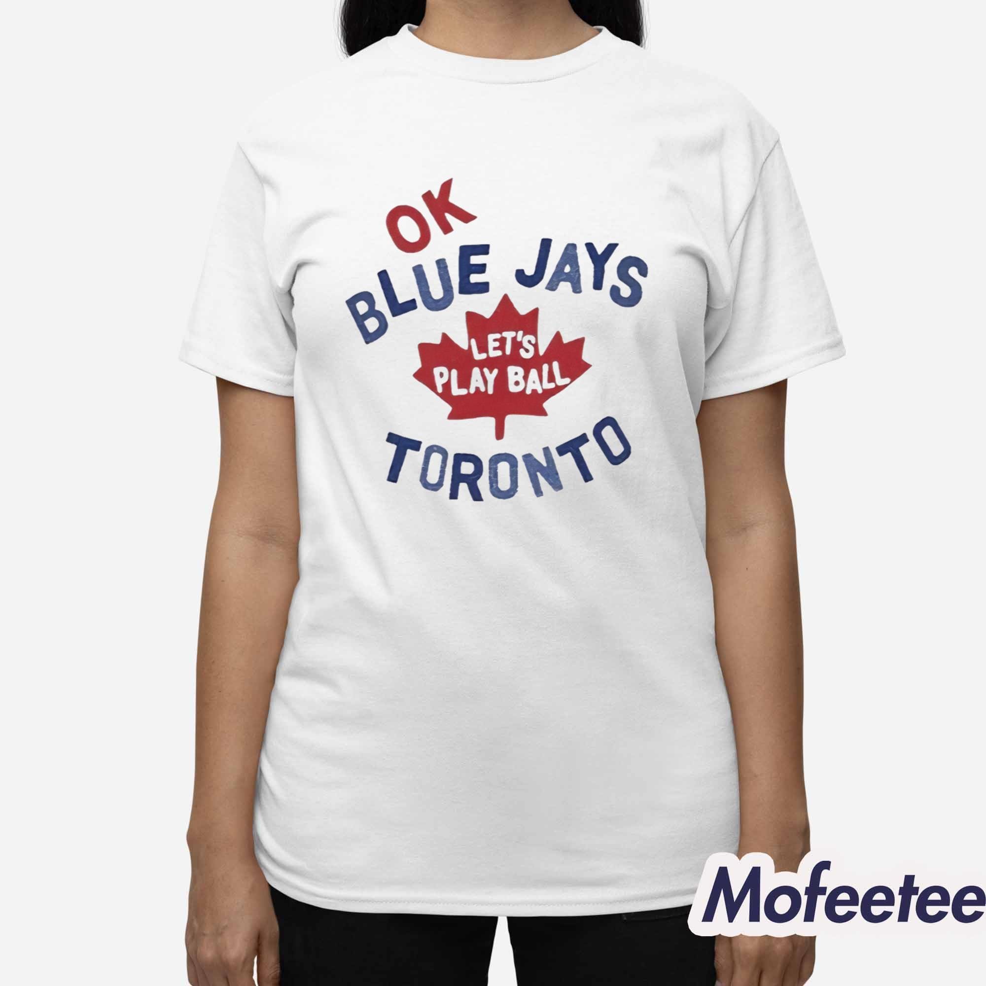 The shirt features a bold and vibrant design, showcasing the iconic maple leaf logo in red and blue with the phrase “OK BLUE JAYS LET’S PLAY BALL TORONTO.” This shirt is crafted to be a conversation starter, representing not only the Blue Jays but also the excitement of the game. The graphic is simple yet impactful, offering a clean, modern look that’s perfect for any fan.