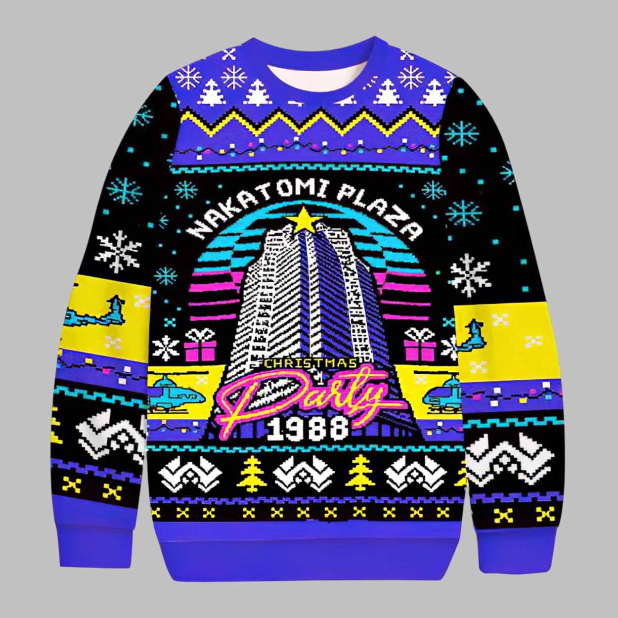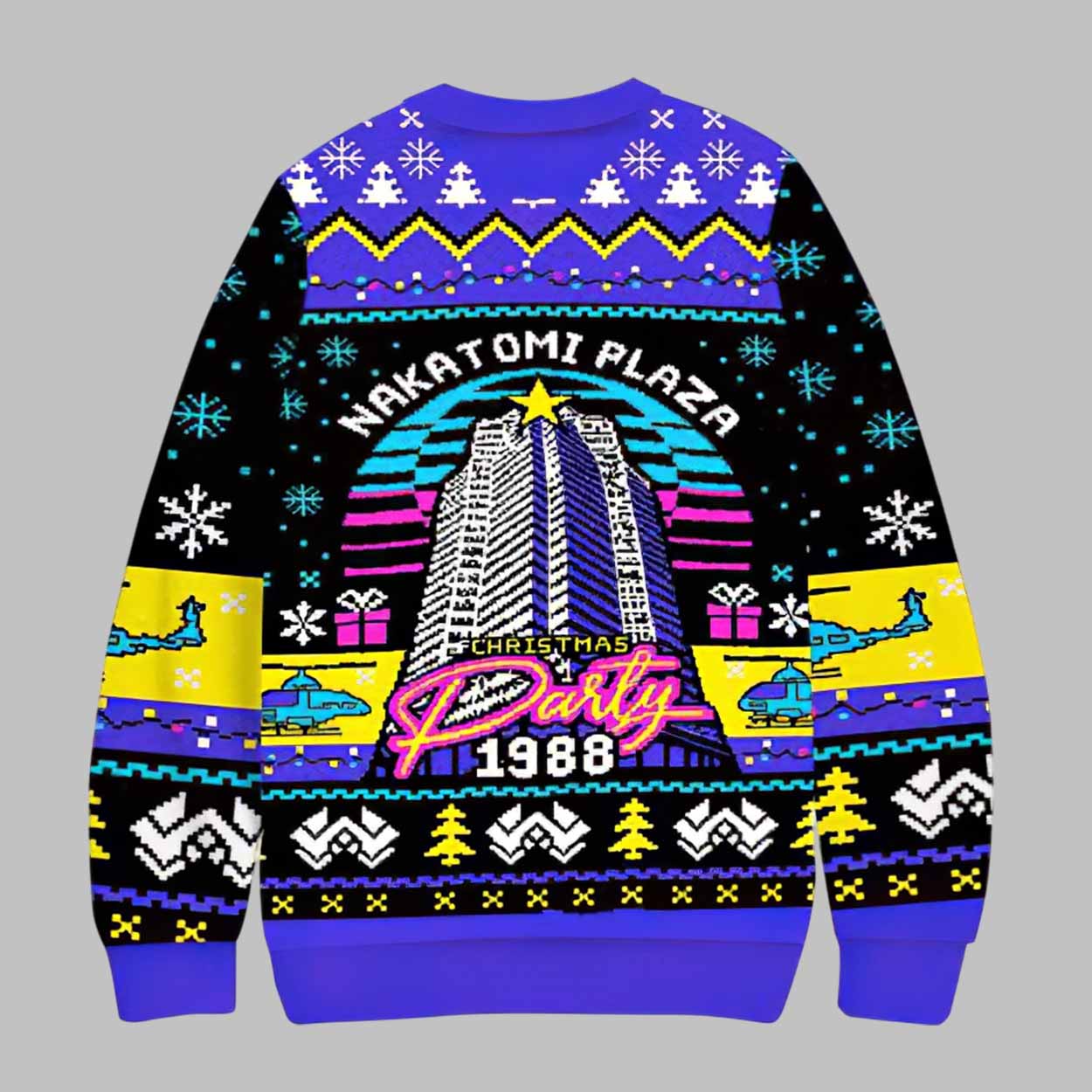 This sweater captures the neon glow and quirky charm of 1980s holiday aesthetics. Featuring a detailed illustration of Nakatomi Plaza wrapped in retro stripes, snowflakes, presents, and neon signage, the design blends humor with nostalgia. Bright accents of purple, yellow, blue, black, and pink create a vibrant color palette that pops in any festive setting. Pixelated patterns, helicopters, holiday trees, and geometric lines complete the sweater’s unique “ugly Christmas” style—perfect for fans of fun, playful holiday apparel.