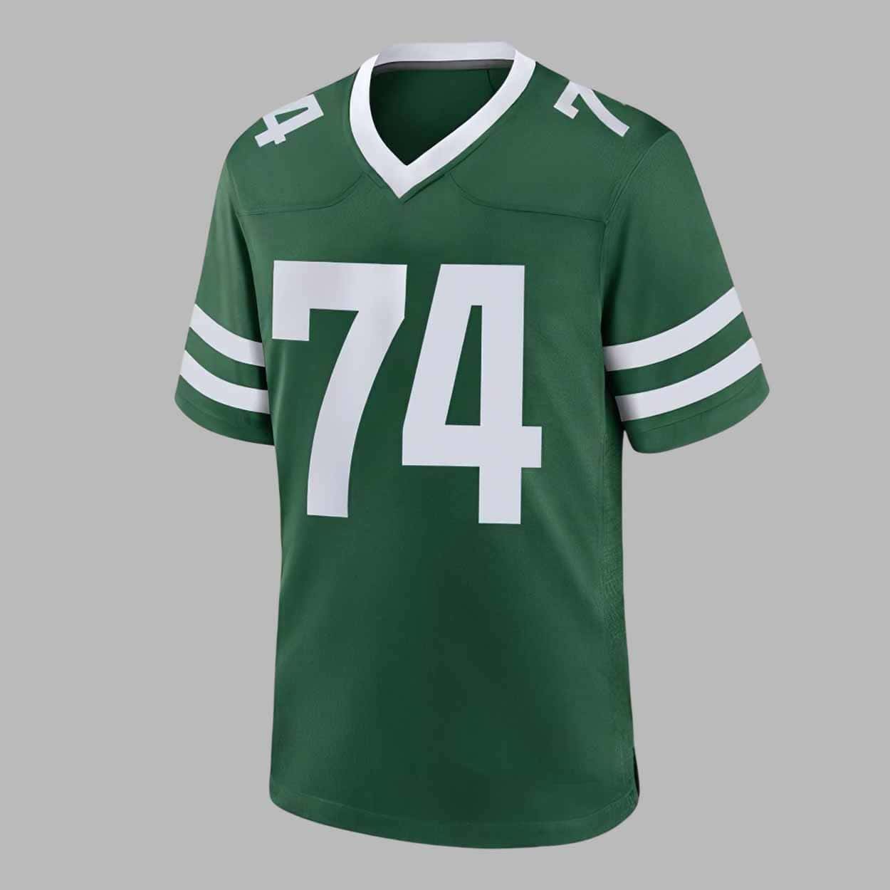 The jersey features a vibrant green design with white detailing, showcasing Mangold’s iconic #74. The jersey is a tribute to his time with the Jets, celebrating his unforgettable contribution to the team. The front of the jersey displays a large #74, while the back proudly displays “MANGOLD” and his signature, ensuring it stands out as a true collector’s piece.
