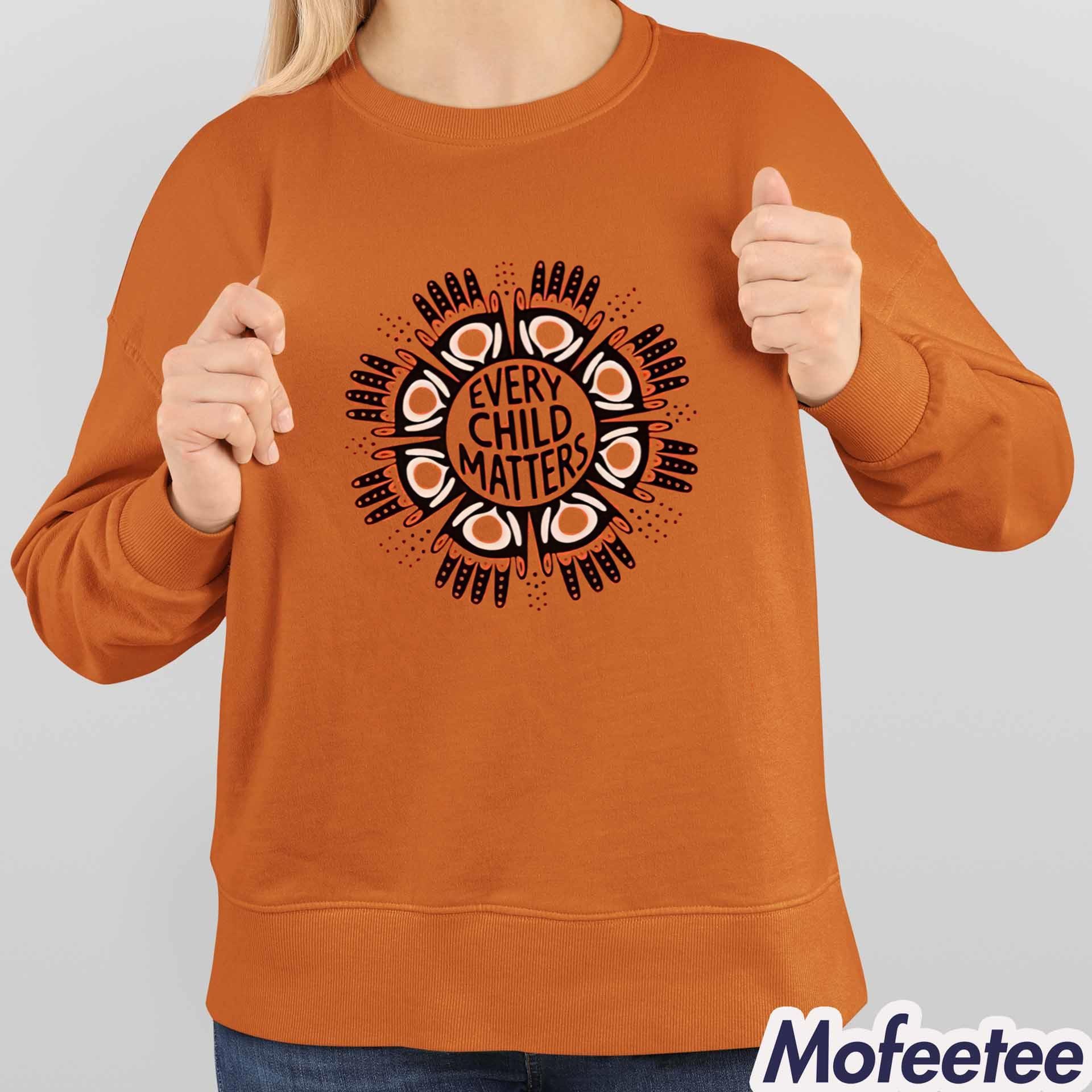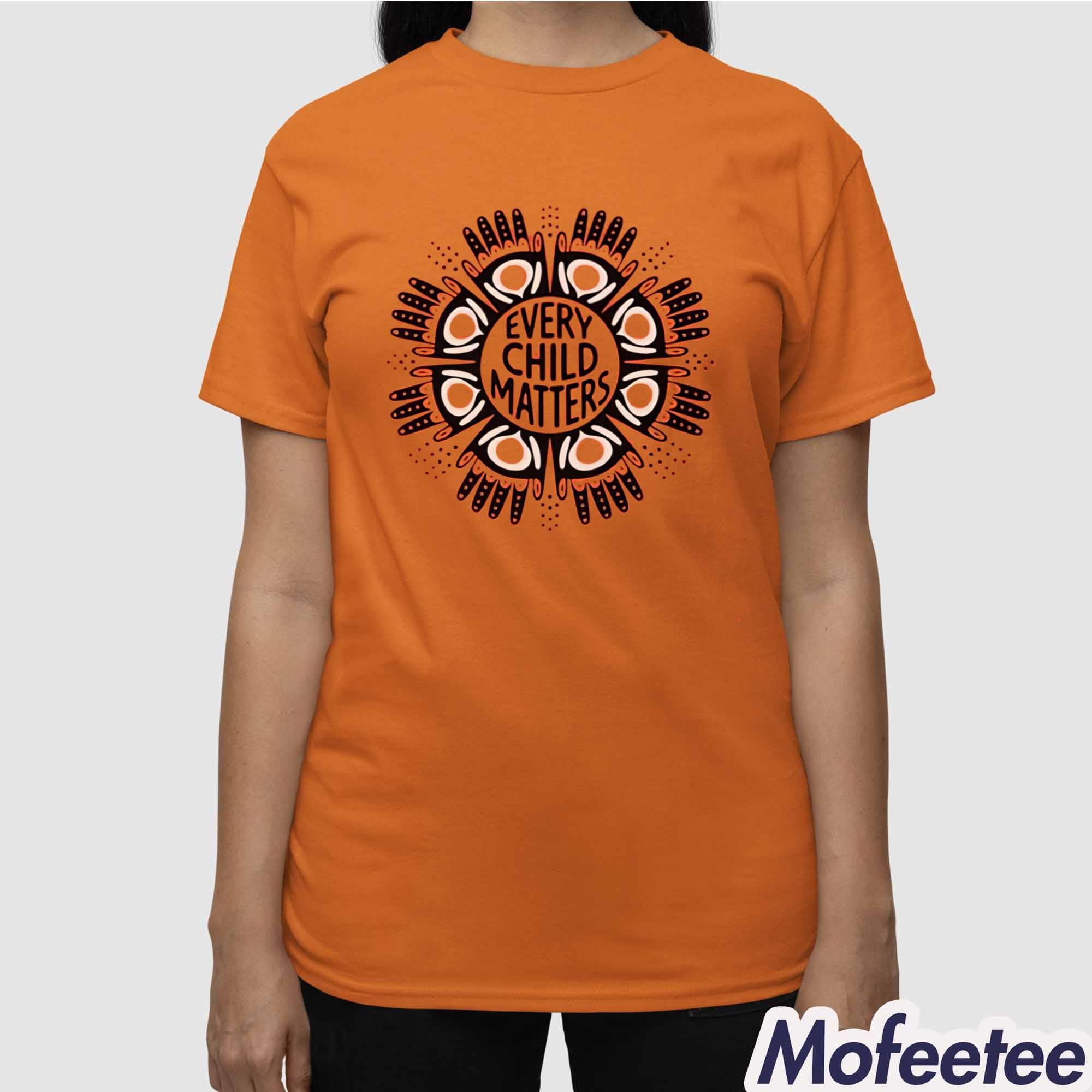 The shirt is designed with a vibrant orange background, which is symbolic of Orange Shirt Day. The shirt features a bold graphic in the center: an Indigenous circle symbol, surrounded by handprints that represent the children whose voices were taken by the residential school system. Inside the circle, the words “EVERY CHILD MATTERS” are prominently displayed, creating a powerful reminder of the need to honor and support Indigenous children everywhere.