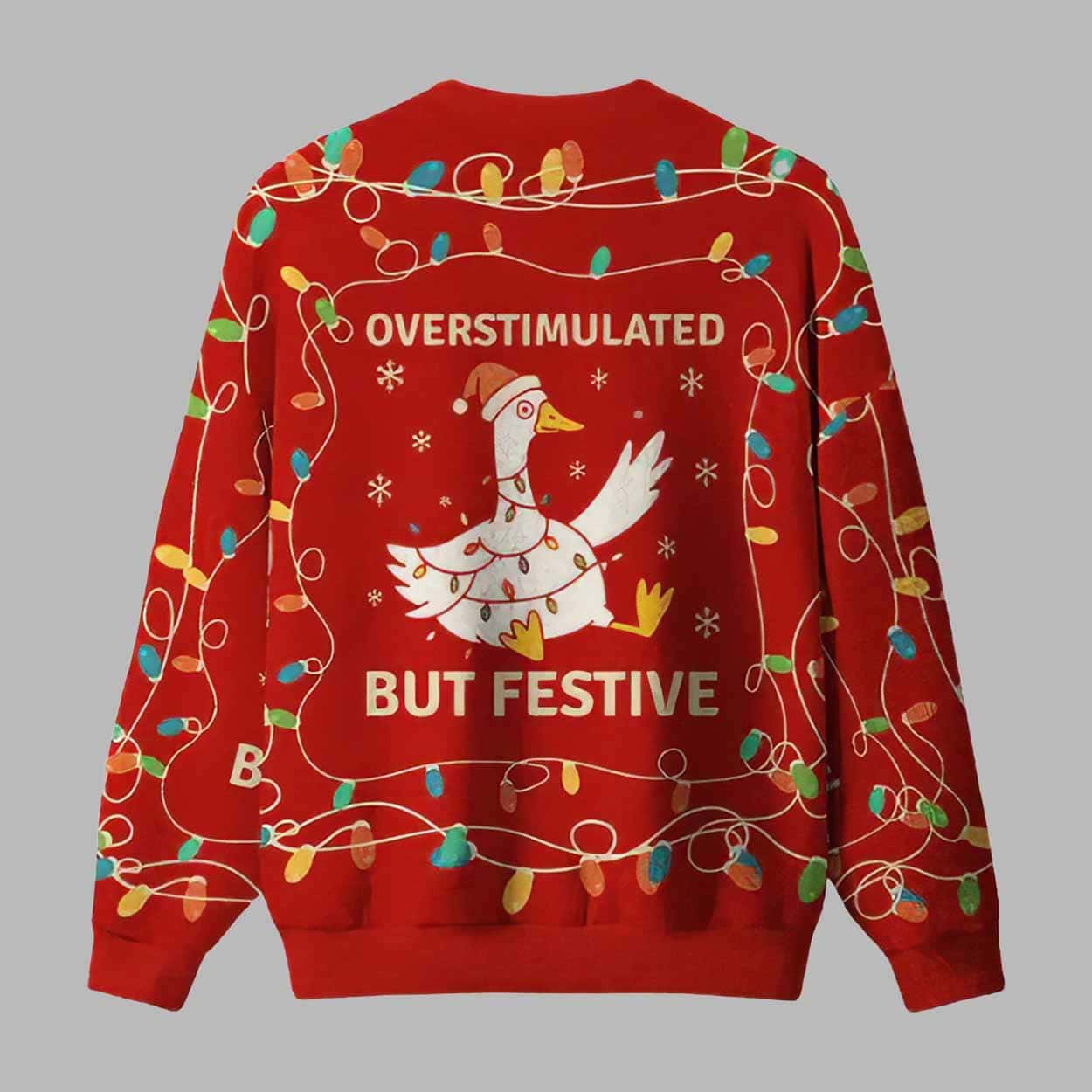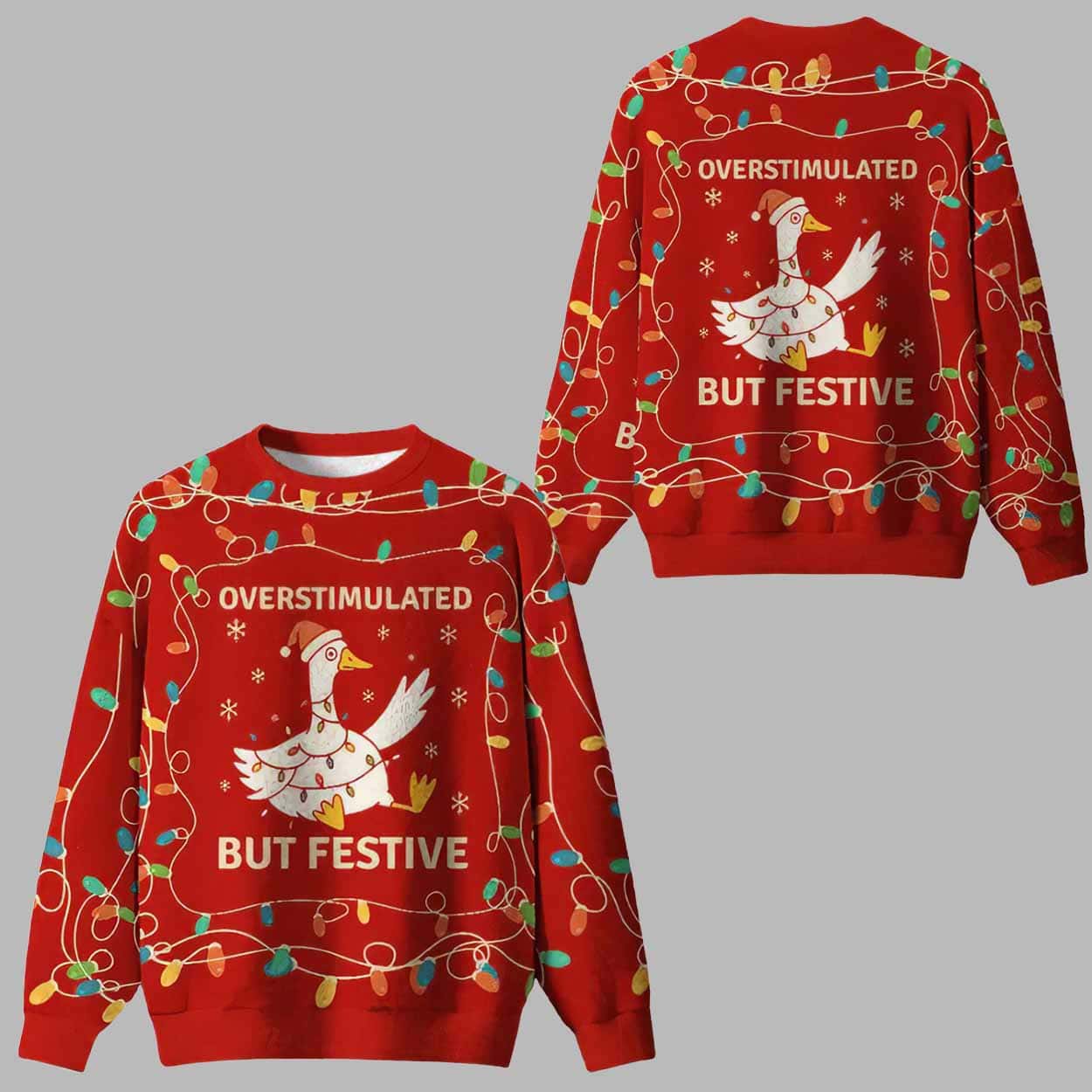 The ugly christmas sweater is designed for those who love the holidays but also know the feeling of sensory overload during all the lights, music, and cheer. Featuring a charming goose wrapped in twinkling Christmas lights with a Santa hat, itâs both hilarious and heartwarming â a true embodiment of modern holiday humor. The bold phrase âOverstimulated But Festiveâ printed across the front and back makes it clear that even when youâve had enough, youâre still bringing the spirit!