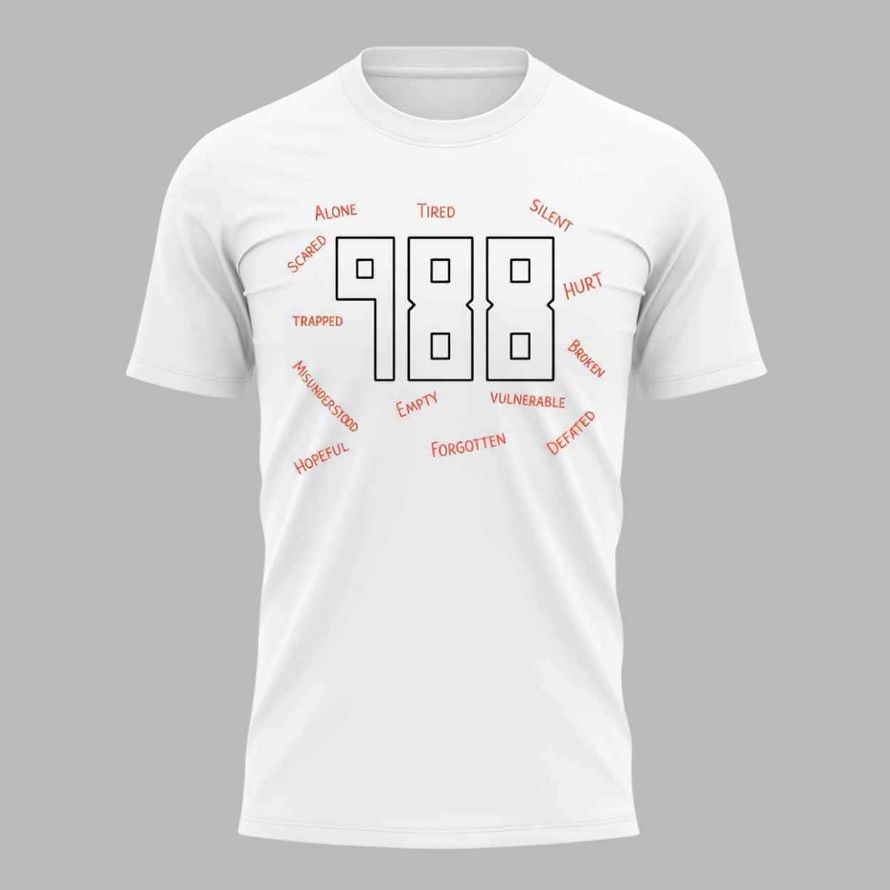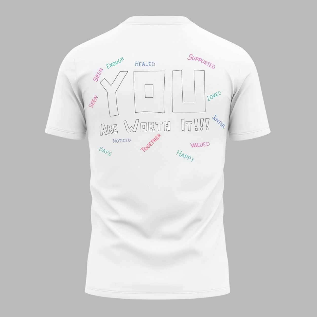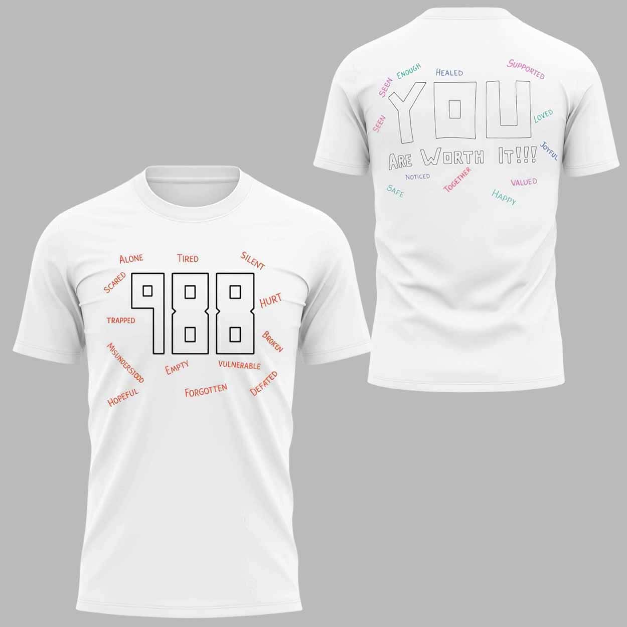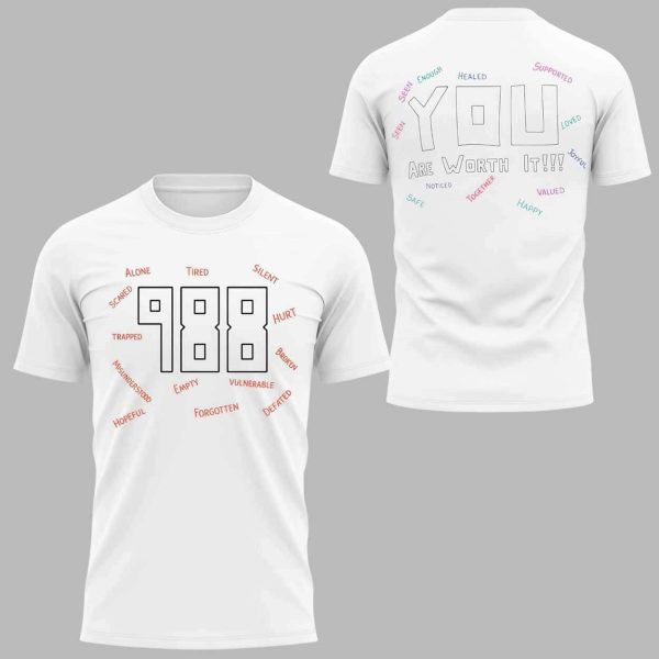 The shirt features a clean, simple design with the number 988 and thoughtful words surrounding it on the front, while the back boldly displays the message “YOU Are Worth It!!!” in large, colorful letters. This eye-catching design makes an impact and is sure to spark conversations wherever you go.