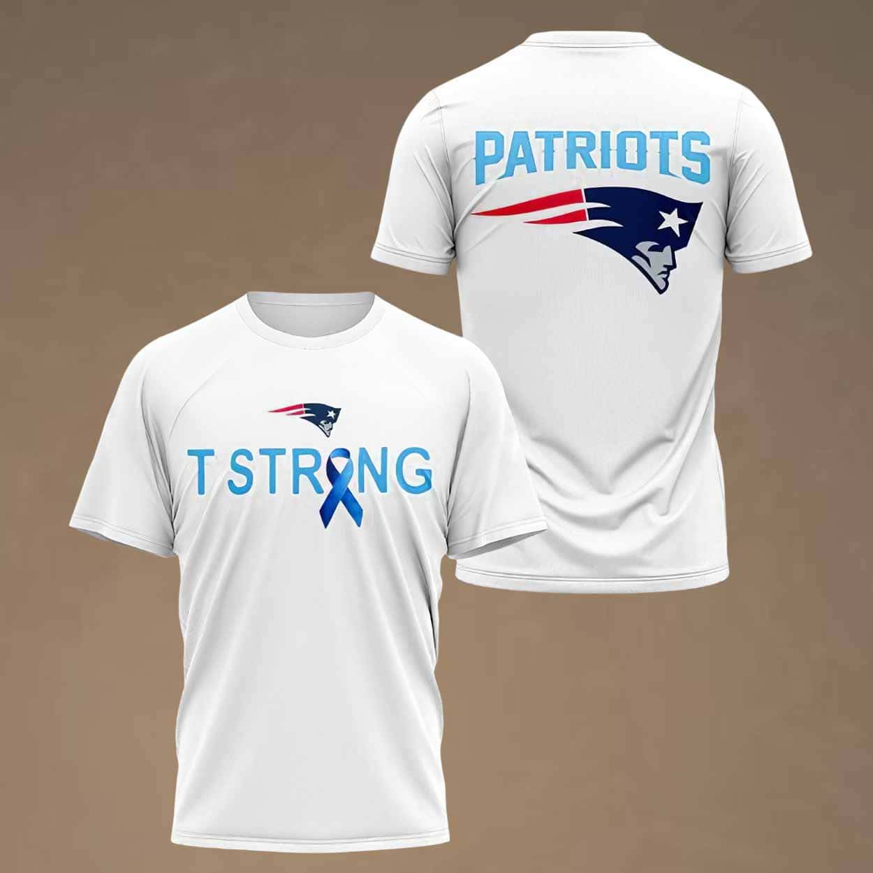 This shirt combines comfort, durability, and meaningful design in one. On the front, it features the word T STRONG with a bold blue ribbon in the center—an emblem of awareness and hope. Above it sits the Patriots logo, reminding you that this is about more than just football; it’s about community and support. On the back, the shirt proudly displays the large Patriots wordmark and team logo, ensuring your message is visible from every angle.