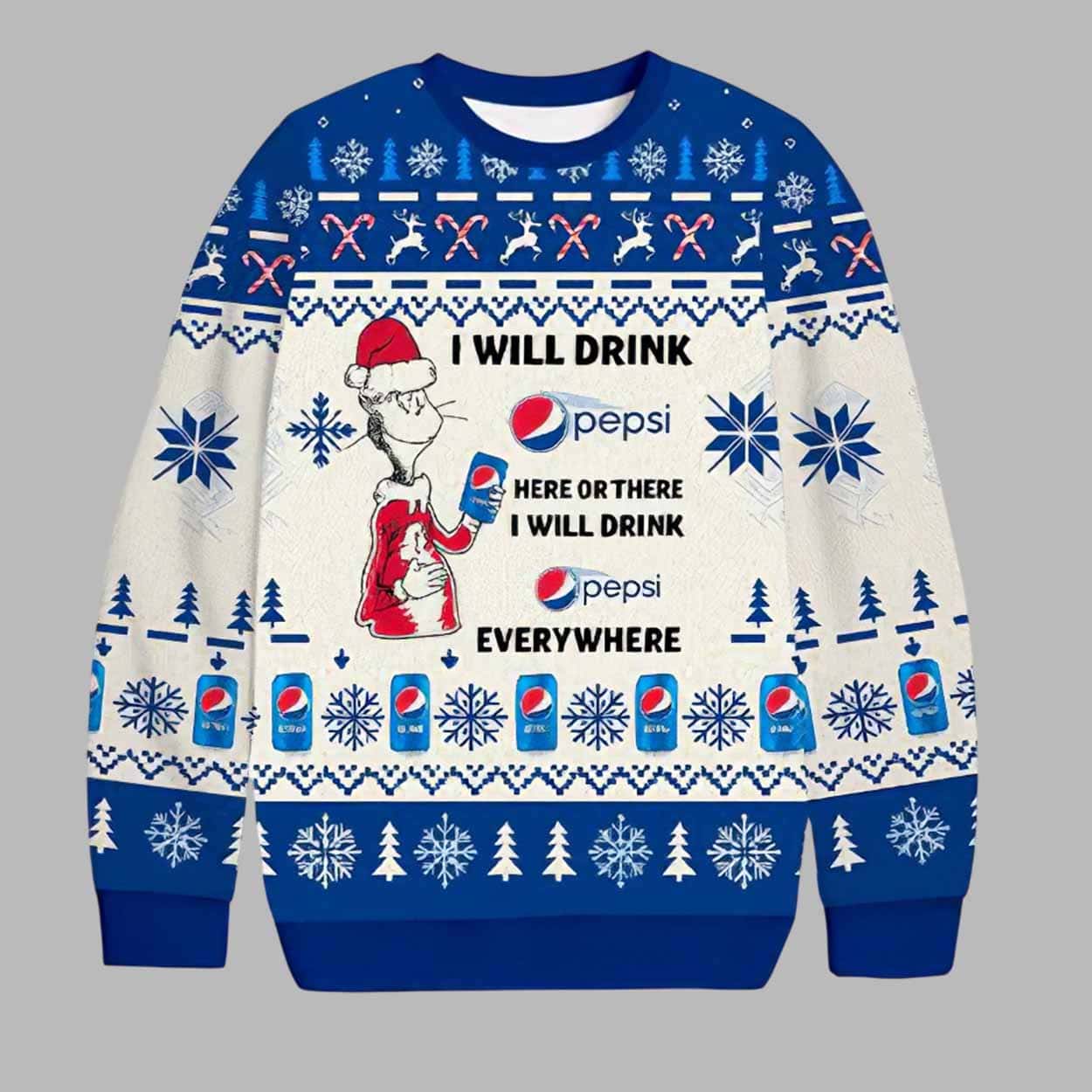 If you want a sweater that instantly brings smiles, starts conversations, and guarantees youâll be remembered at every holiday event, this is the one. Order your Pepsi Cat Hat I Will Drink Every Where Ugly Christmas Sweater today and bring a hilarious twist to your festive wardrobe!