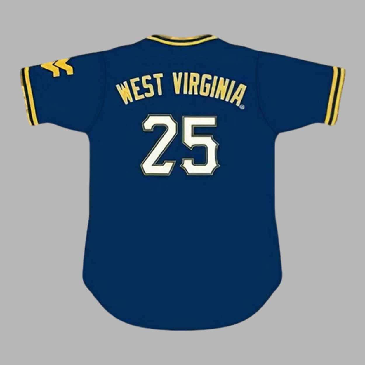 The jersey 2025 giveaway features a striking navy blue base accented with golden yellow details that honor the iconic West Virginia color scheme. “PIRATES” is stitched boldly across the front in classic varsity-style lettering, with the number “25” representing the 2025 season displayed just below. On the back, “WEST VIRGINIA” arcs proudly above the number 25, giving a true sense of identity and connection.